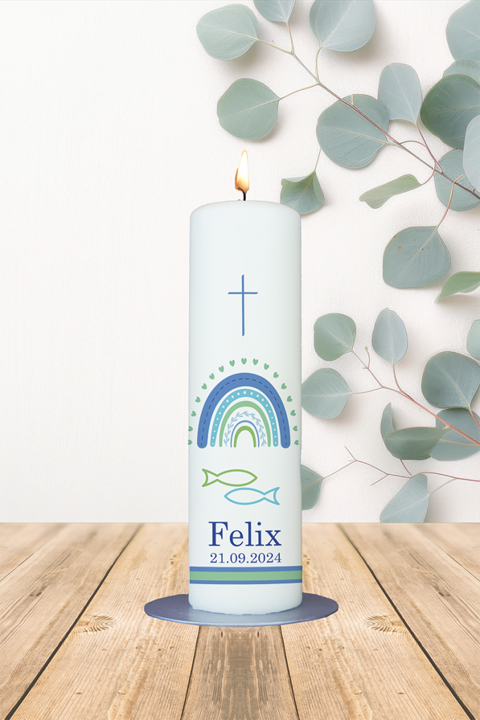 Zart wie ein Wassertropfen und voller Farbe – diese Aquarell-Kerze zeigt einen Regenbogen in Grün- und Blautönen, gekrönt von einem kleinen Herzchenbogen. Der Name „Felix“ und das Datum runden das Design ab. Ein Licht voller Segen, Hoffnung und Freude.