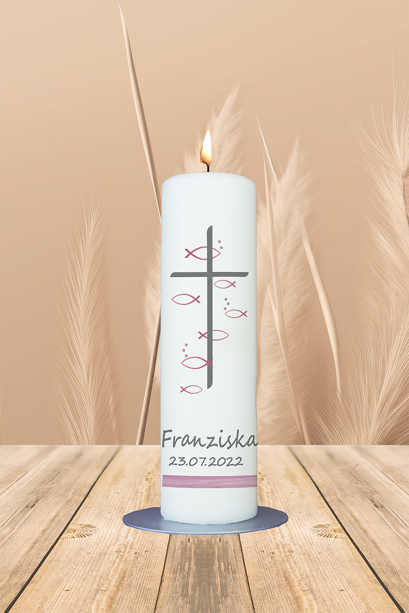 Verspielt und ausdrucksstark zugleich: Pinkfarbene Fische ziehen hinter einem dezenten grauen Kreuz ihre Bahnen. Mit dem Namen „Franziska“ und dem Taufdatum entsteht ein individuelles Licht, das liebevoll an diesen besonderen Tag erinnert.