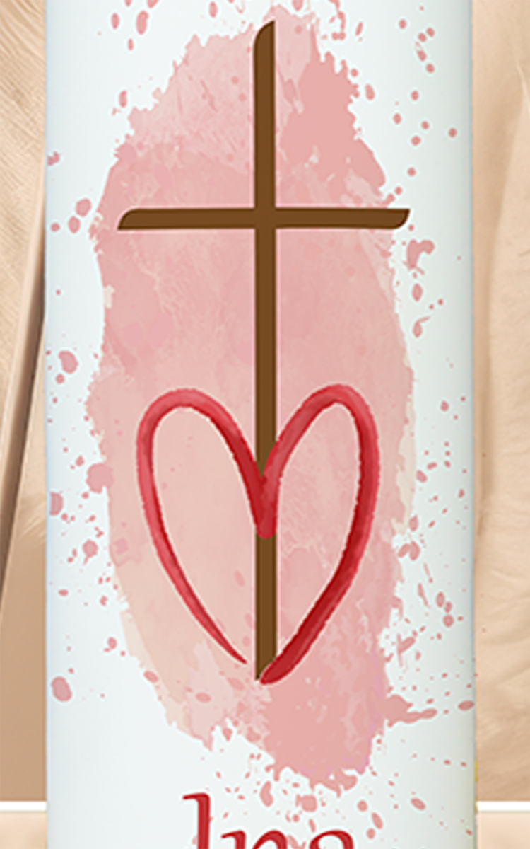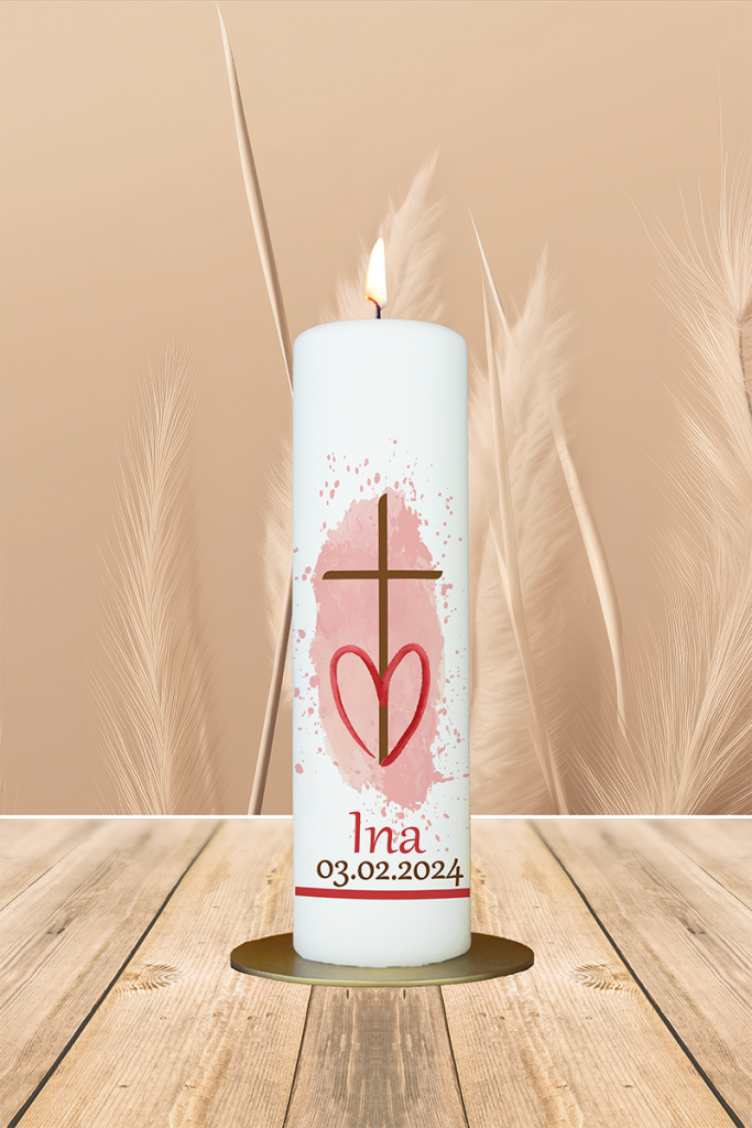 Diese Kerze vereint das Symbol der Liebe – das Herz – mit dem Kreuz als Zeichen des Glaubens. Eingebettet in einen sanften rosa Hintergrund erzählt sie von Geborgenheit, Vertrauen und Zuwendung. Der Name „Ina“ und das Datum in warmen Erdtönen machen sie zu einem besonders liebevollen Licht zur Taufe.