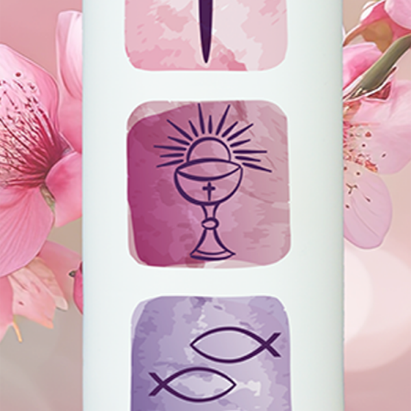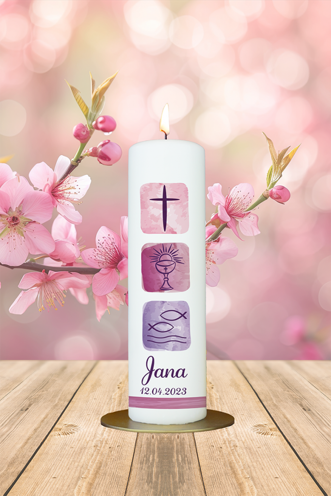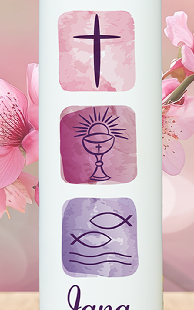 Diese moderne Kerze zeigt drei zentrale Symbole des christlichen Glaubens: das Kreuz für Gottes Nähe, den Kelch für das Sakrament und die Fische als Erkennungszeichen der frühen Christen. Mit ihrer zarten Aquarell-Optik und dem Namen „Jana“ wird sie zu einer bedeutungsvollen Taufkerze mit stilvoller Tiefe.