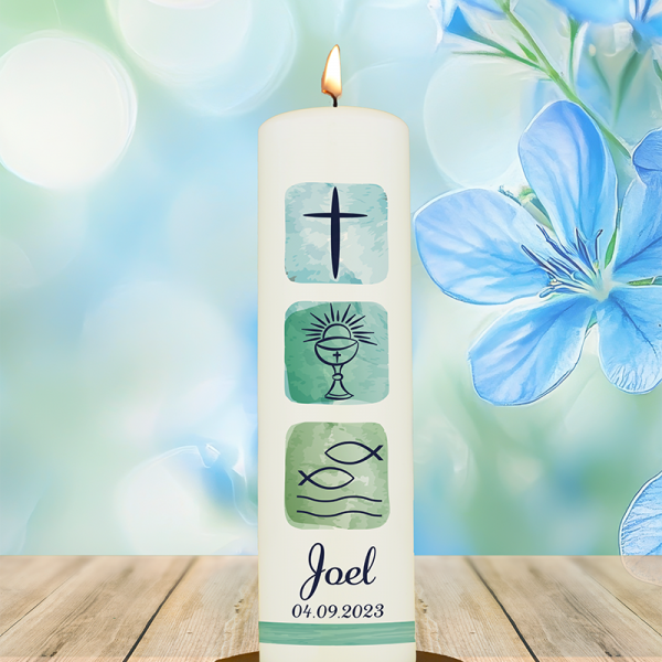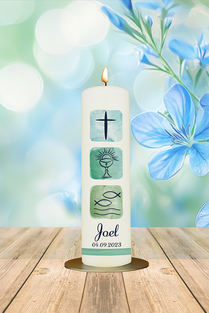 Diese moderne Kerze zeigt drei zentrale Symbole des christlichen Glaubens: das Kreuz für Gottes Nähe, den Kelch für das Sakrament und die Fische als Erkennungszeichen der frühen Christen. Mit ihrer zarten Aquarell-Optik und dem Namen „Joel“ wird sie zu einer bedeutungsvollen Taufkerze mit stilvoller Tiefe.