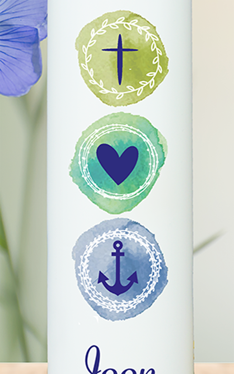 Glaube, Liebe, Hoffnung – dargestellt durch Kreuz, Herz und Anker in zarten Aquarellfarben. Diese Taufkerze bringt die drei stärksten christlichen Symbole auf moderne Weise zusammen. Mit dem Namen „Joan“ und einem personalisierbaren Datum wird sie zu einem kraftvollen Licht fürs Leben.