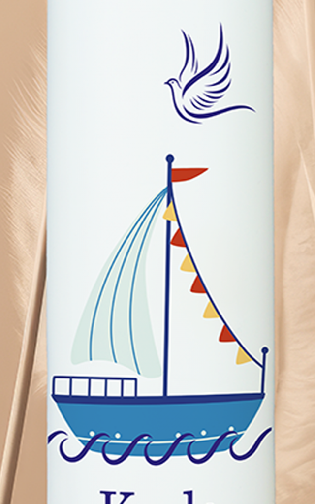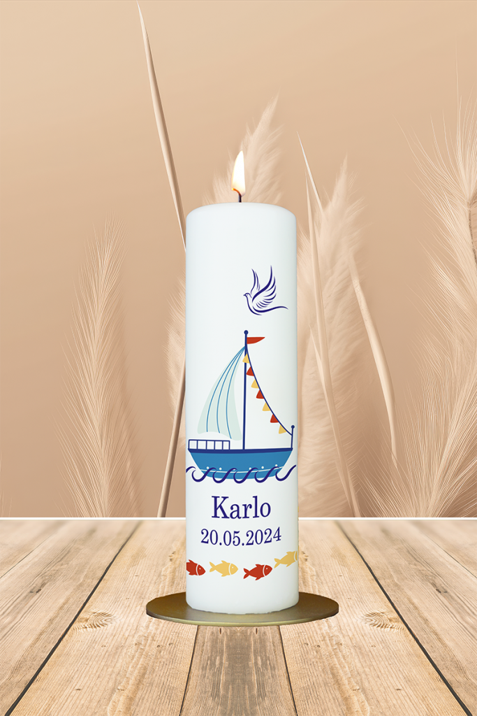 Ein kleines Segelschiff auf dem Wasser, begleitet von einer Taube und farbigen Fischen – dieses Motiv steht für Vertrauen, Bewegung und göttliche Begleitung. Die Kerze mit dem Namen „Karlo“ in Blau bringt die Botschaft mit: Auf allen Wegen mögest du geführt und behütet sein.