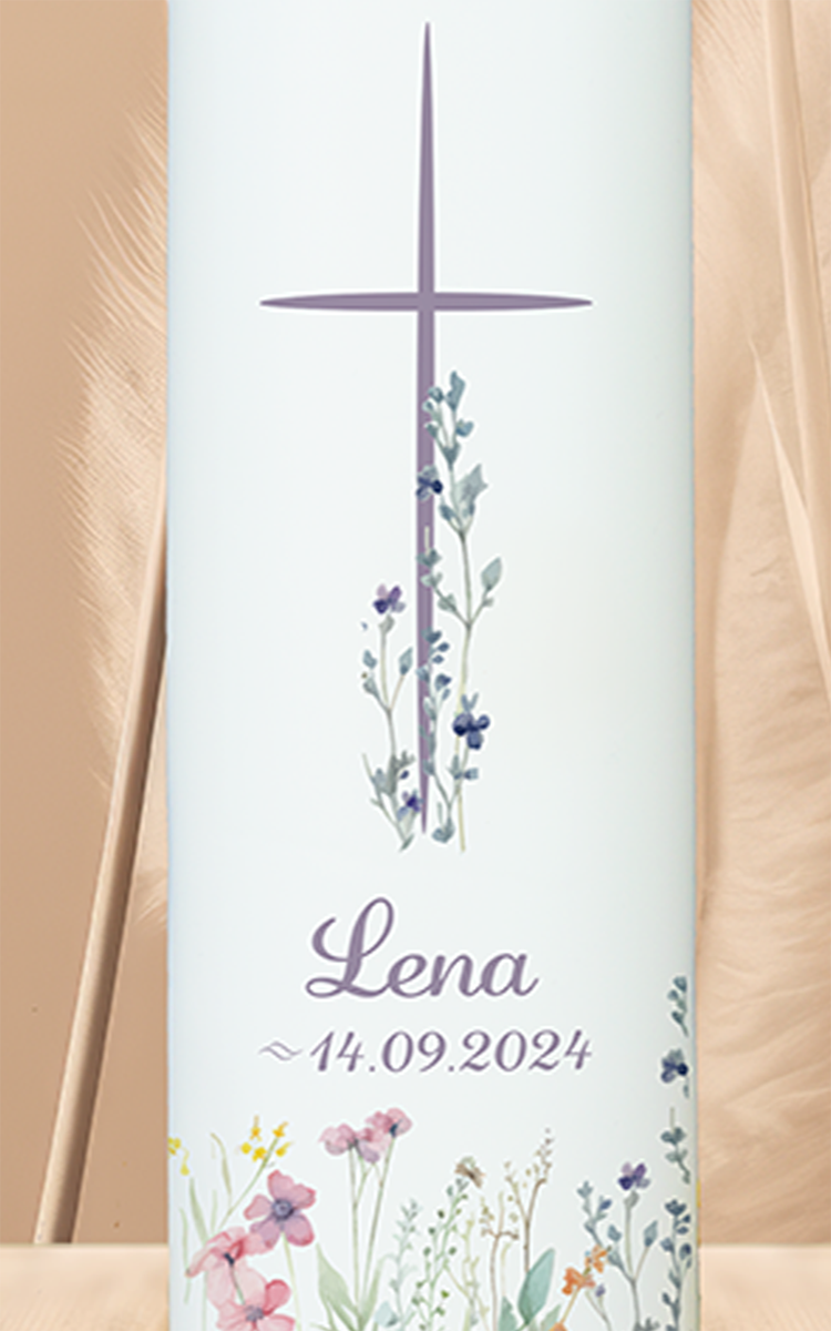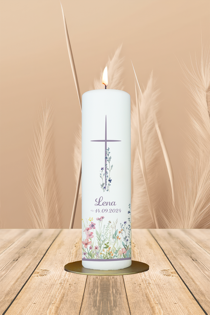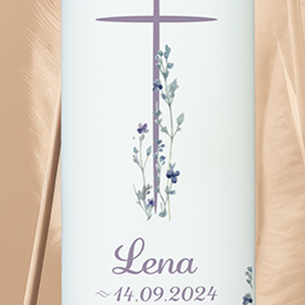 Sanft, blühend und lichtvoll: Das lilafarbene Kreuz über einer frühlingshaften Blumenwiese bringt die Botschaft vom blühenden Glauben und neuer Hoffnung. Mit dem Namen „Lena“ und einem feinen, harmonischen Farbschema wird diese Taufkerze zu einem liebevollen Licht für einen gesegneten Neubeginn.