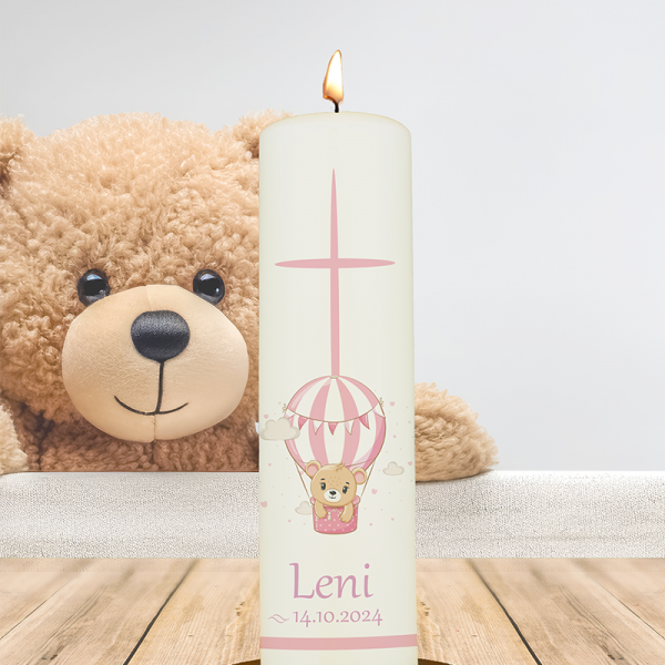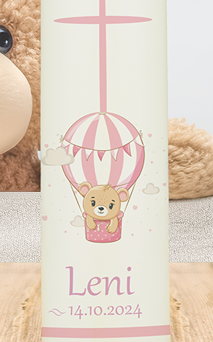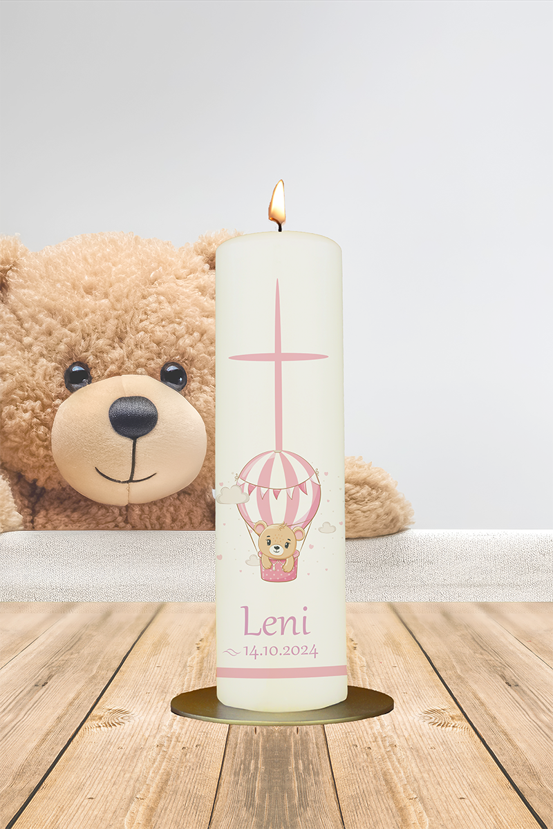 Ein kleiner Teddybär schwebt sanft im rosa Heißluftballon vor einem zarten Kreuz – ein Bild voller Geborgenheit, Leichtigkeit und Segen. Diese Kerze für „Leni“ ist nicht nur niedlich, sondern auch ein sinnbildlicher Wunsch: Möge das Leben sanft tragen und der Glaube stets mitfliegen. Text und Datum sind individuell anpassbar.