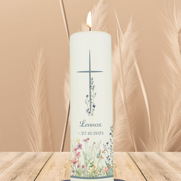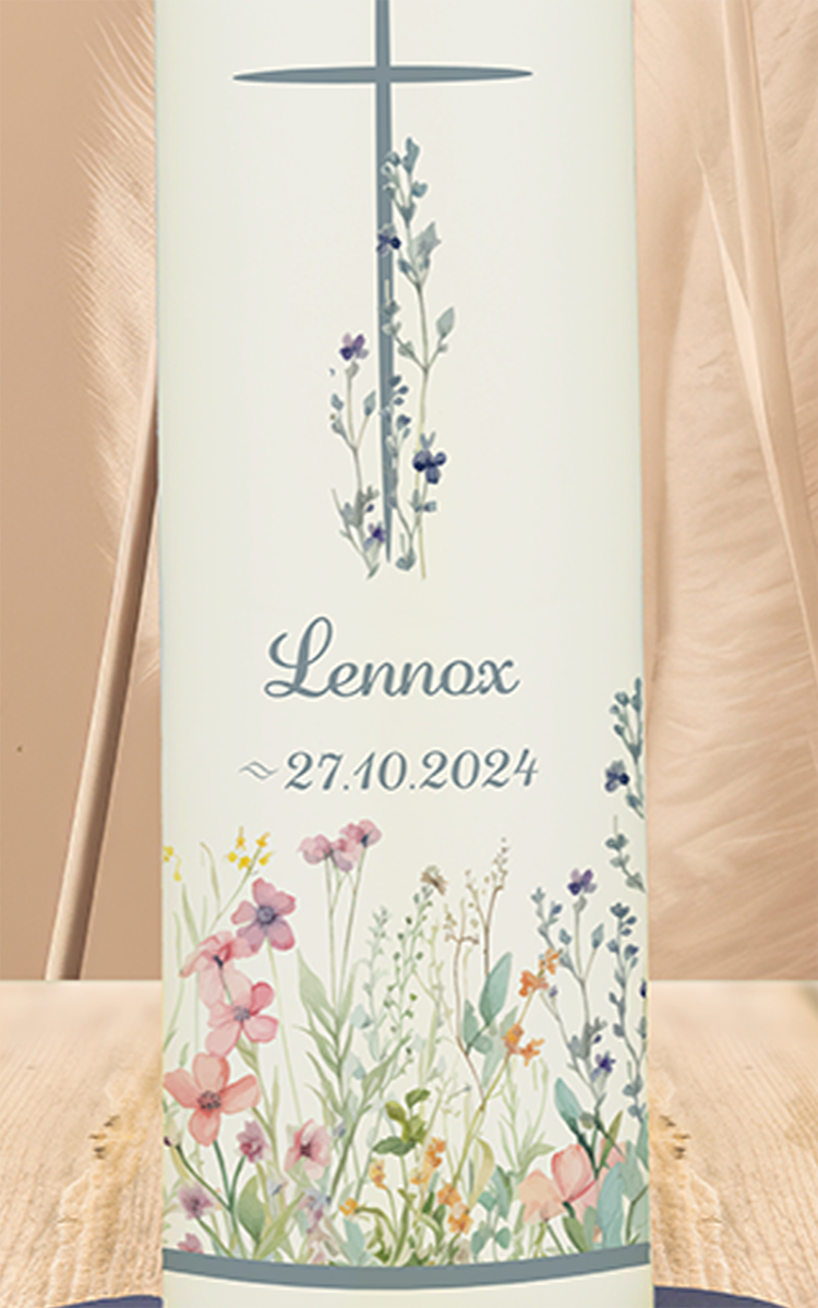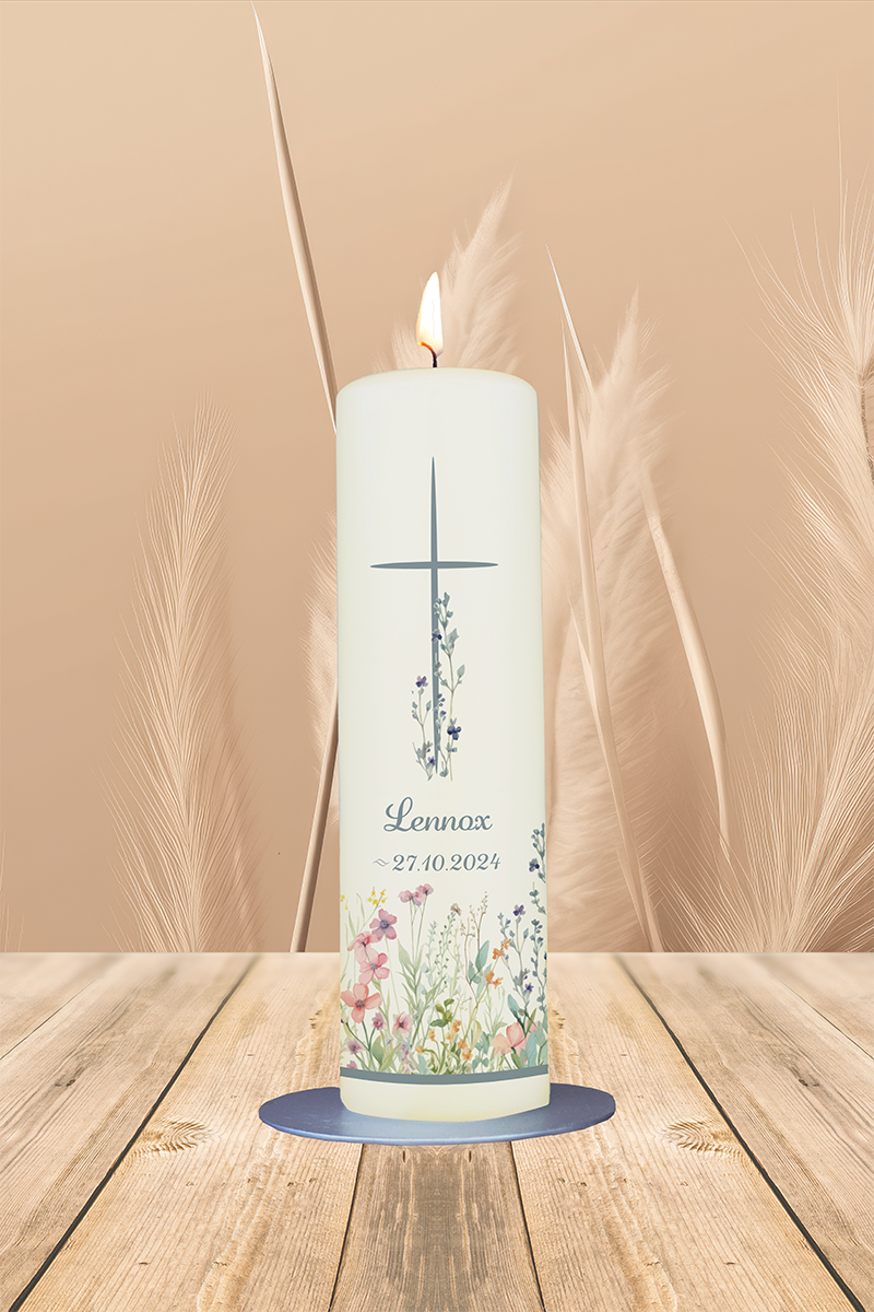 Ein einfaches Kreuz, das sich über eine lebendige Blumenwiese erhebt – dieses Motiv steht für neues Leben, blühenden Glauben und Gottes Nähe im Alltag. Die Taufkerze für „Lennox“ strahlt Freude und Hoffnung aus und kann mit Namen und Datum personalisiert werden.