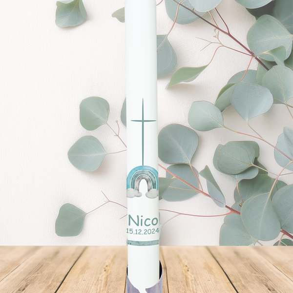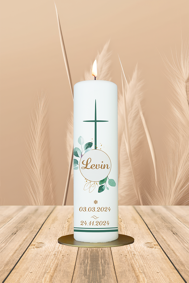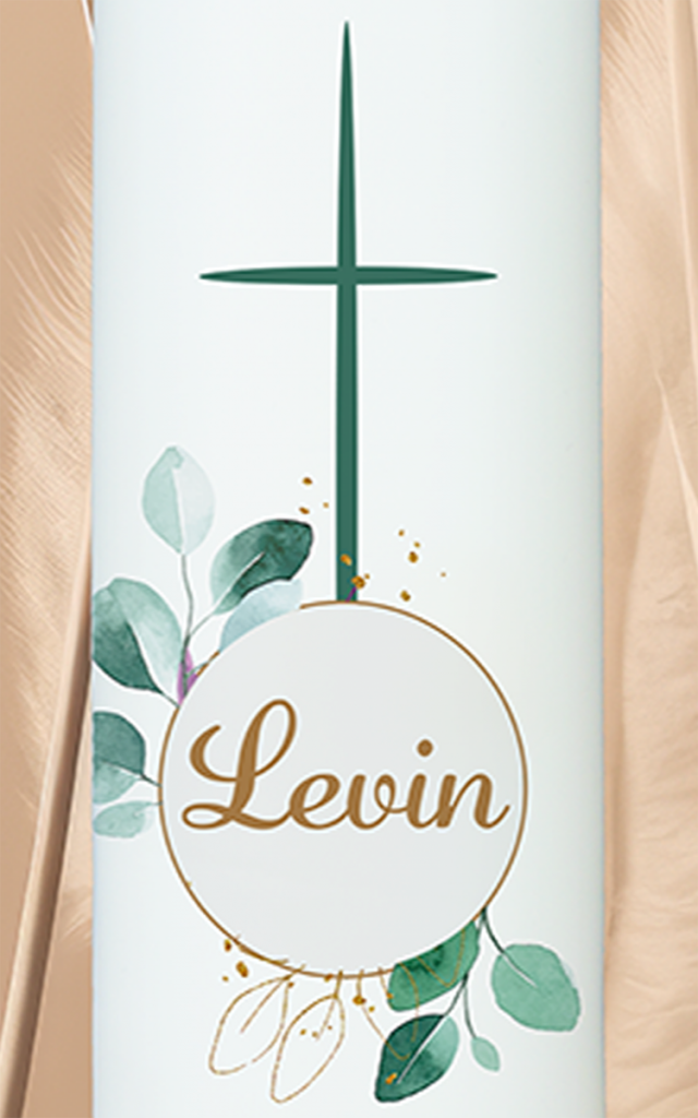 Sanft und naturverbunden zeigt sich diese Taufkerze mit einem Eukalyptuszweig vor einem grünem Kreuz – ein Zeichen für Wachstum, Stärke und Segen. Die beiden Daten (z.?B. Geburt & Taufe) machen sie zu einem persönlichen Lichtbegleiter für einen einzigartigen Lebensanfang. Der Name „Levin“ ist liebevoll eingebunden und kann individuell angepasst werden.