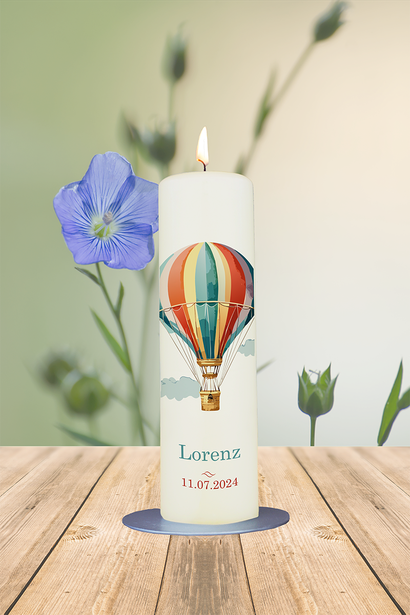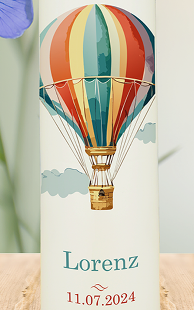 Ein Heißluftballon symbolisiert Aufbruch, Leichtigkeit und das Vertrauen, sich dem Wind des Lebens anzuvertrauen. Diese farbenfrohe Taufkerze mit dem Namen „Lorenz“ (in Blau) und dem Datum (in Rot) ist ein Sinnbild für den Beginn einer ganz persönlichen Reise. Die Farben können individuell gewählt werden – für eine Kerze, die mit Herz und Bedeutung leuchtet.