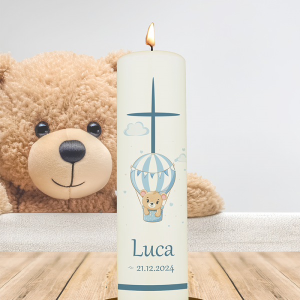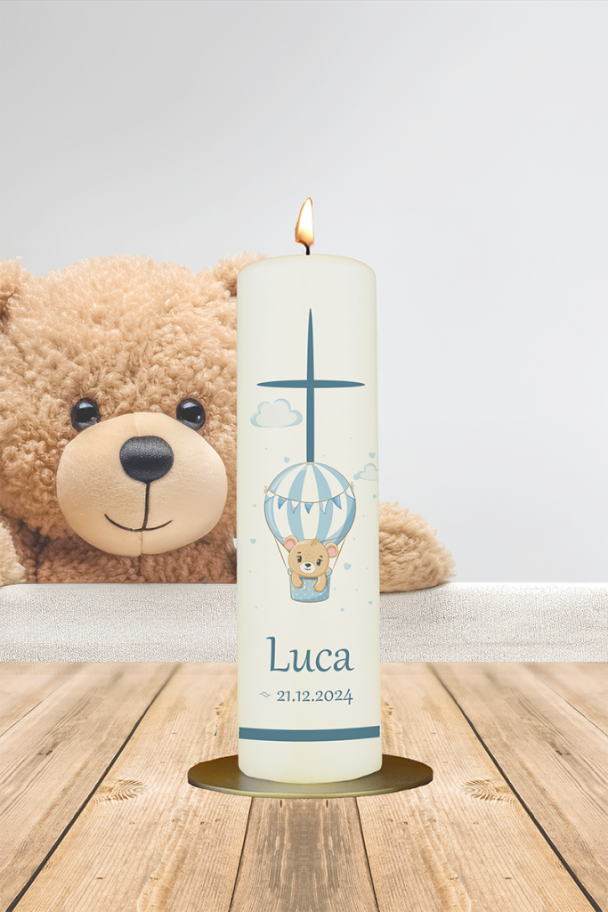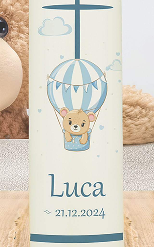 Ein blau-weißer Heißluftballon steigt sanft empor – ein starkes Sinnbild für Aufbruch, Hoffnung und göttlichen Rückenwind. Die Kerze für „Luca“ ist modern, freundlich und leicht zu personalisieren – für einen besonderen Start ins Leben.