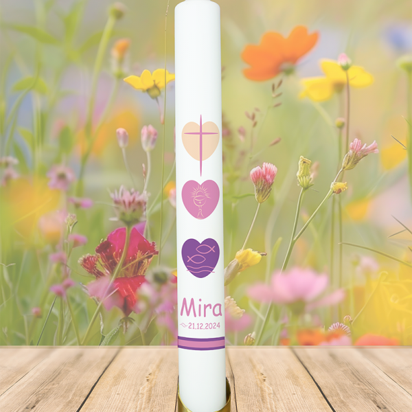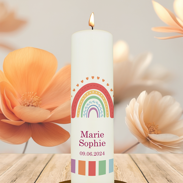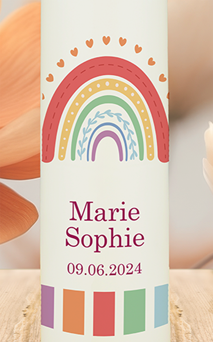 Ein bunter Regenbogen, gekrönt von einem feinen Herzchenbogen in Orange, erzählt von Hoffnung, Liebe und Gottes Versprechen. Die Kerze für „Marie Sophie“ wirkt fröhlich, kindlich und tiefsinnig zugleich – ein Licht, das mitwächst.