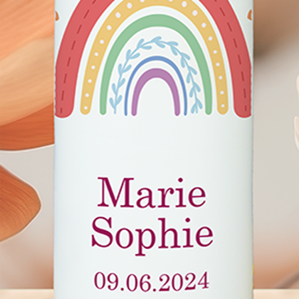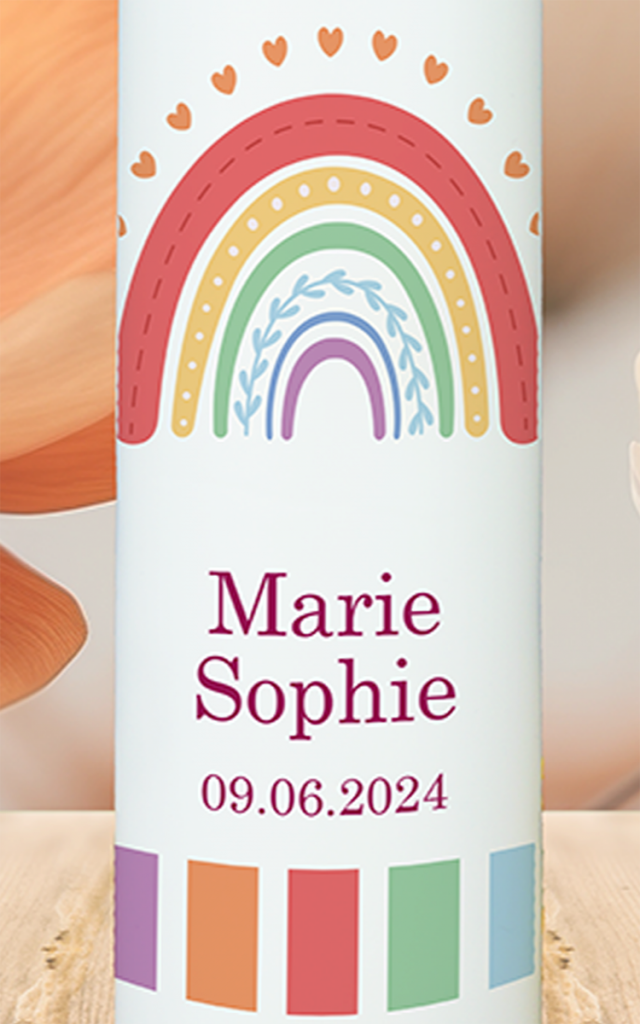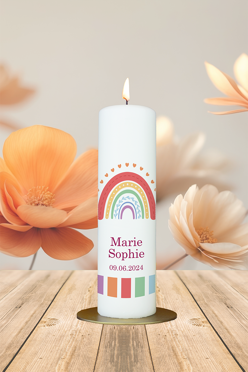Ein bunter Regenbogen, gekrönt von einem feinen Herzchenbogen in Orange, erzählt von Hoffnung, Liebe und Gottes Versprechen. Die Kerze für „Marie Sophie“ wirkt fröhlich, kindlich und tiefsinnig zugleich – ein Licht, das mitwächst.