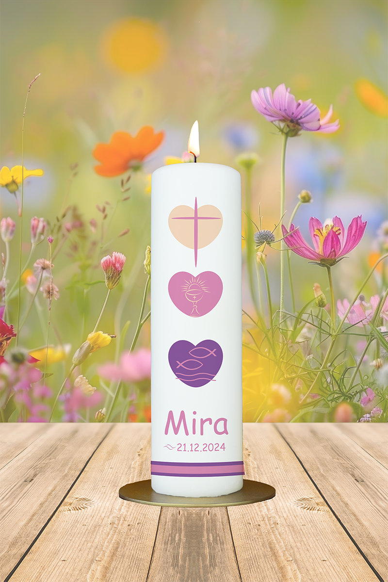 Tauf- / Kommunionkerze 25x7cm Mira Herzen rosa