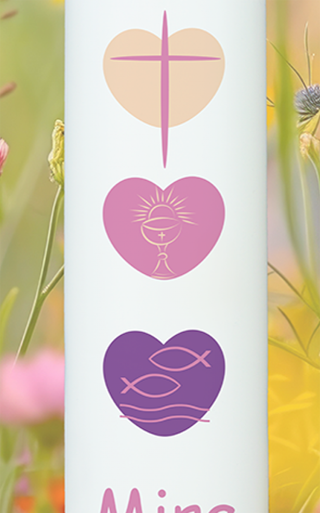 Diese Taufkerze bringt die stärksten christlichen Symbole in drei kleinen Herzen unter: Glaube, Sakrament, Zugehörigkeit. Sie strahlt Wärme, Liebe und Symbolkraft aus – mit dem Namen „Mira“ und dem Taufdatum personalisiert, wird sie zum bleibenden Erinnerungslicht für einen unvergesslichen Tag.