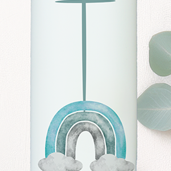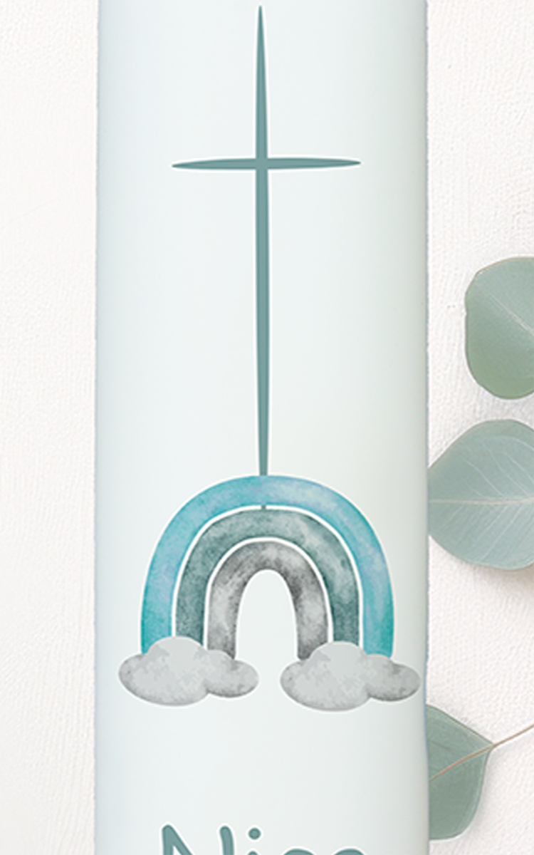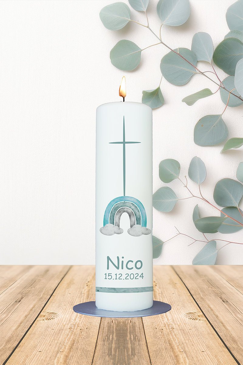 Ein farbenfroher Regenbogen überspannt ein schlichtes Kreuz – Symbol für Gottes Versprechen, neue Wege und Geborgenheit. Die Kerze für „Nico“ verbindet Fröhlichkeit mit spiritueller Tiefe. Name und Datum können selbstverständlich angepasst werden.