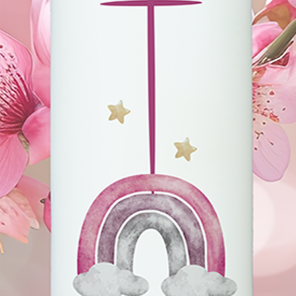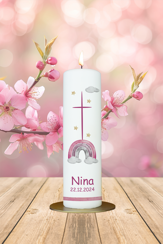 Zarte Farben, spirituelle Kraft: Der Regenbogen in lila Tönen steht für Hoffnung, Spiritualität und Schutz. Das Kreuz als Mittelpunkt verankert diese Botschaft. Mit dem Namen „Nina“ und einem personalisierten Datum ist diese Kerze ein besonders lichtvolles Taufgeschenk.