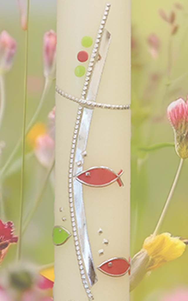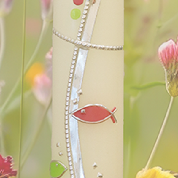 Dieses silberne, leicht geschwungene Kreuz aus einem feinen Perlstreifen und einem schmalen Silberstreifen zeigt, dass Dein Weg einzigartig ist. Die silber-rosa und silber-grünen Fische, der zarte Abschlussrand in Rosa, Silber und Grün machen daraus eine liebevolle Handarbeit. Dein Name und Datum geben diesem Licht Deinen ganz persönlichen Segen, der Dich ein Leben lang begleitet.