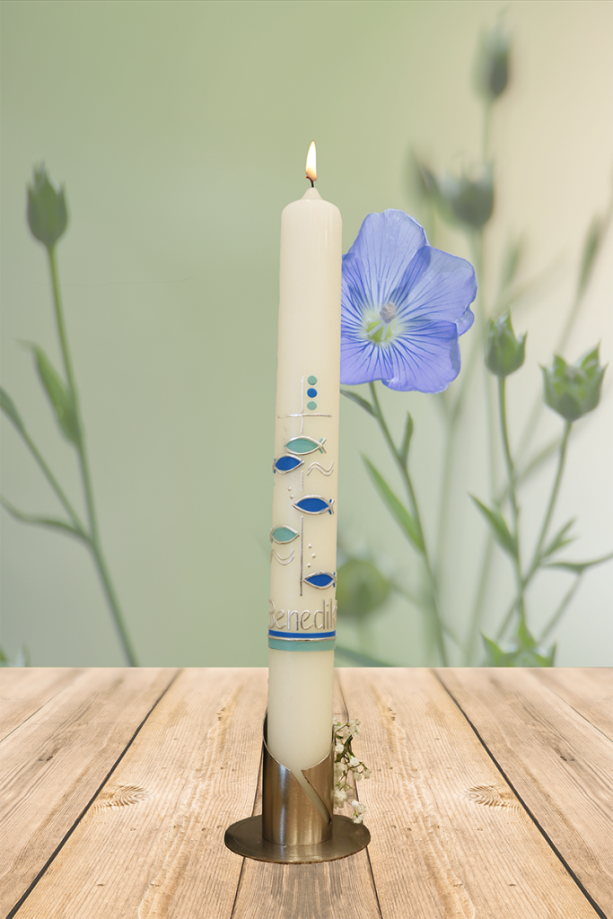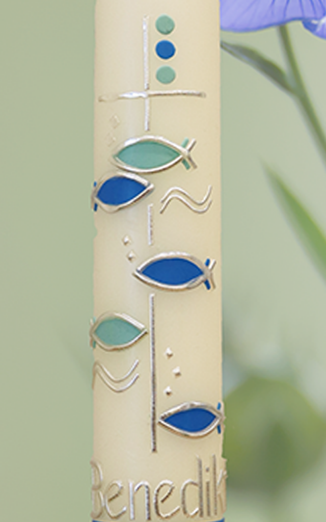 Diese Kerze bringt klare Farben und Symbolik zusammen: Das feine silberne Kreuz, die Fische in Blau-Silber und Mint-Silber zeigen, dass Du Teil von etwas Größerem bist. Dein individueller Name und das Datum machen daraus ein liebevoll handveredeltes Licht, das Dir immer sagt: Du bist getragen von Vertrauen, Gemeinschaft und Liebe.