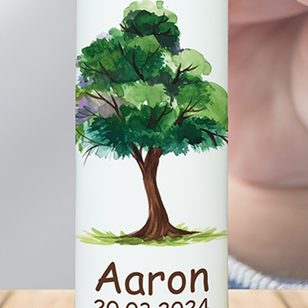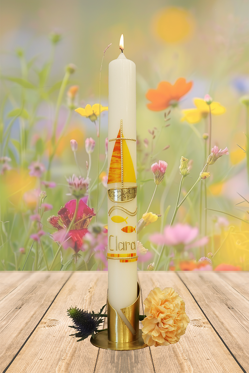 Mit diesem Segelschiff fängt Deine Kerze das Gefühl von Aufbruch und Freiheit ein: Gelb-orange Farbtöne und das goldene Kreuz verbinden alles mit Deinem Glauben. Die sanfte Wellenlinie und die goldene Schrift machen Dein Licht zu einem kleinen Abenteuer, das zeigt: Du kannst loslassen, segeln und weißt doch immer, wo Du zu Hause bist. Dein Name und Datum machen es unverwechselbar.