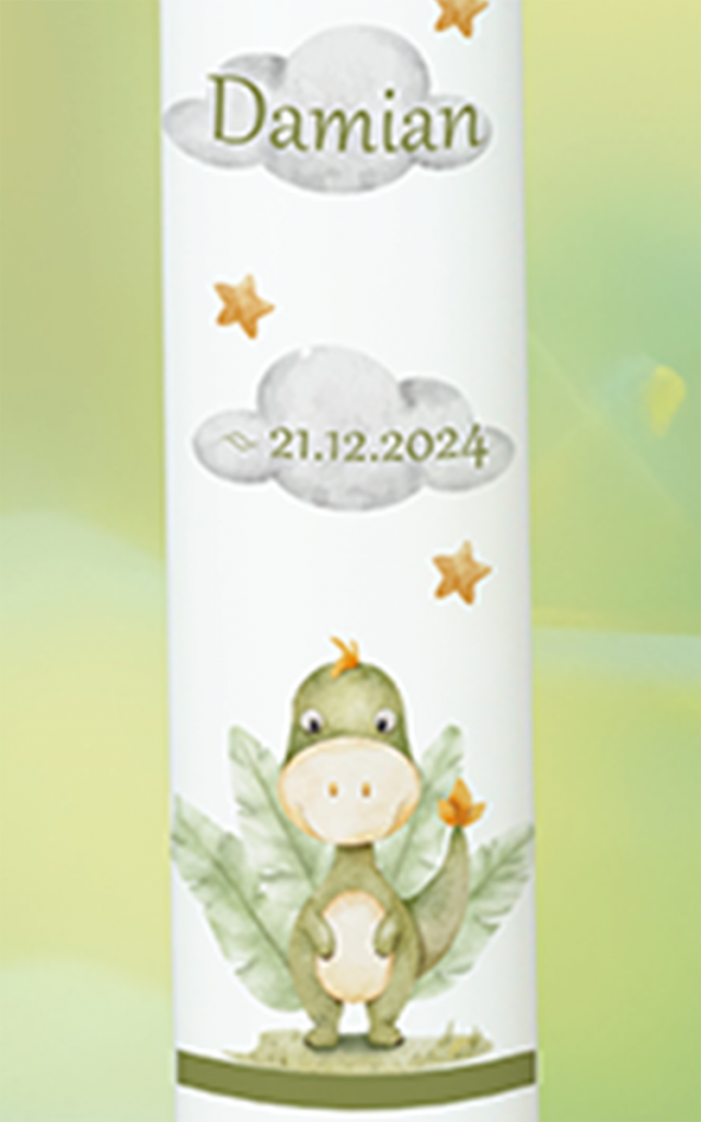 Klein, stark und ganz besonders – dieser süße Dino mit seinen bunten Federn bringt fröhliche Farbe auf die Taufkerze. Der Name „Damian“ in grün und das passende Datum runden das Design ab. Der Text ist auf Wunsch personalisierbar und macht die Kerze zu einem einzigartigen Erinnerungsstück.