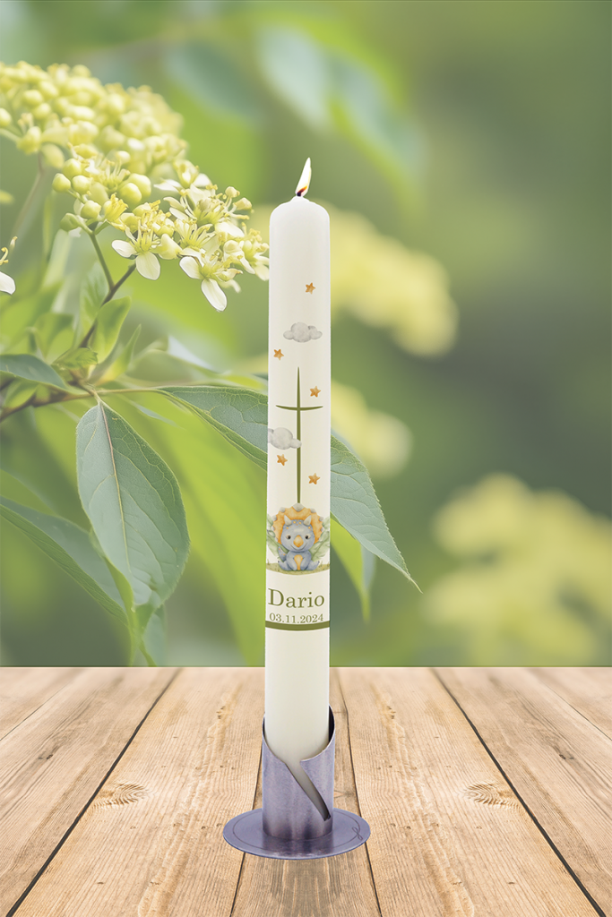 Ein kleiner Dino und ein zartes grünes Kreuz – diese Taufkerze bringt Naturtöne, Wärme und ein Lächeln mit sich. Mit dem Namen „Dario“ und dem Datum personalisiert, entsteht ein ganz individuelles Licht für einen besonderen Tauftag.