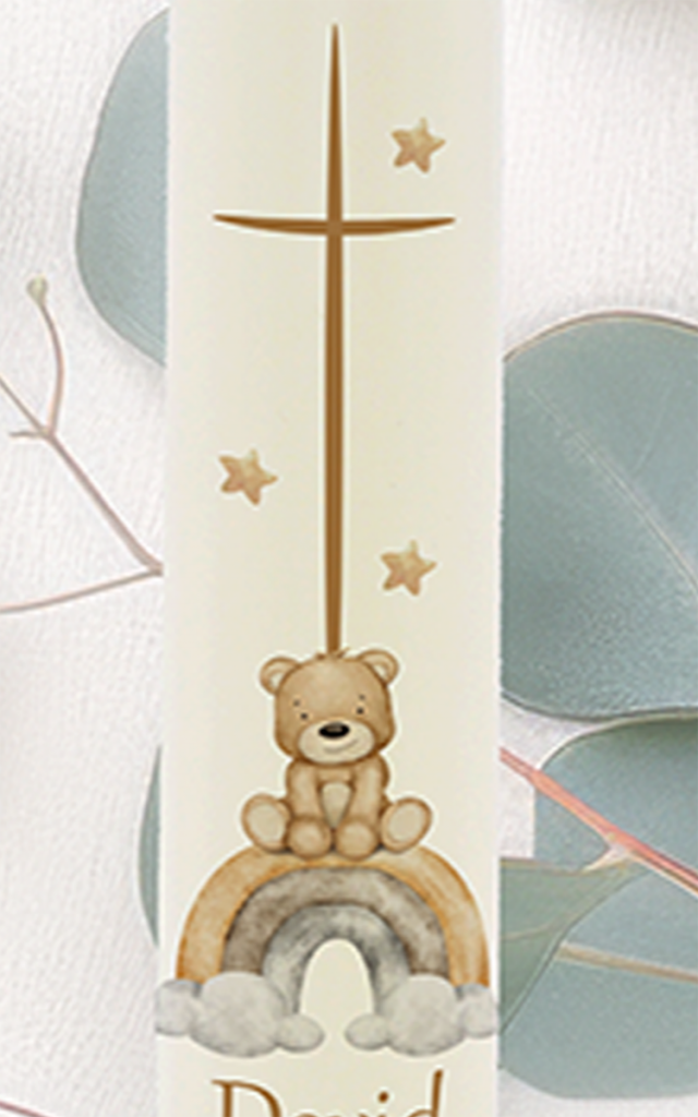 Ein kleiner Bär und ein schlichtes Kreuz in warmem Braun geben dieser Kerze ihren ruhigen, liebevollen Charakter. Der personalisierte Text „David, 17.11.2024“ macht die Kerze zu einem besonderen Begleiter – und zu einem wertvollen Erinnerungsstück für viele Jahre.
