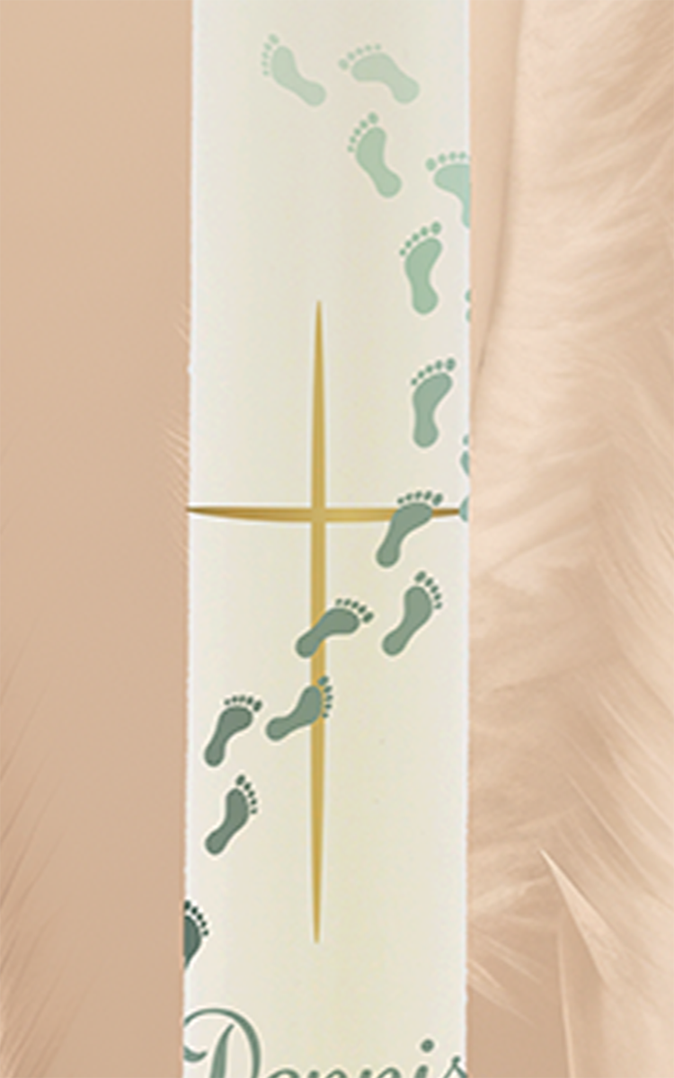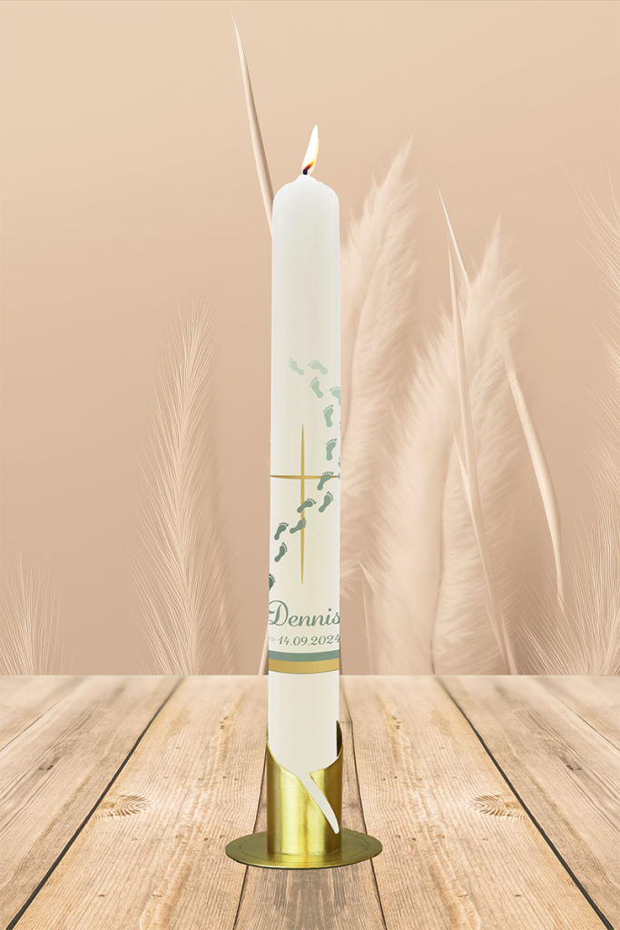 Tauf- / Kommunionkerze 40x4cm Dennis Fußspuren gold