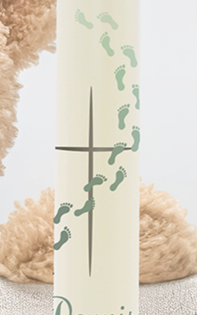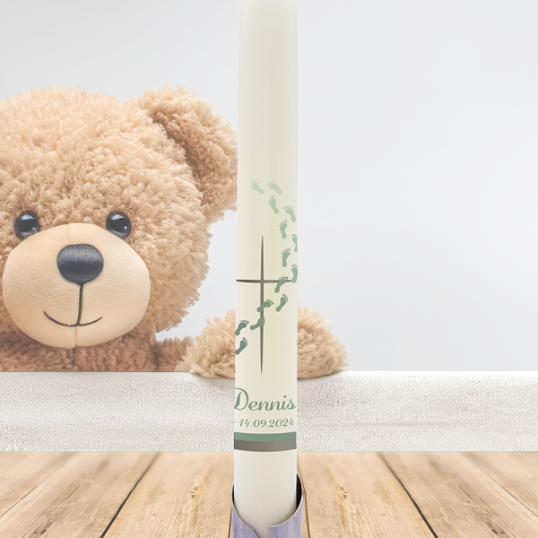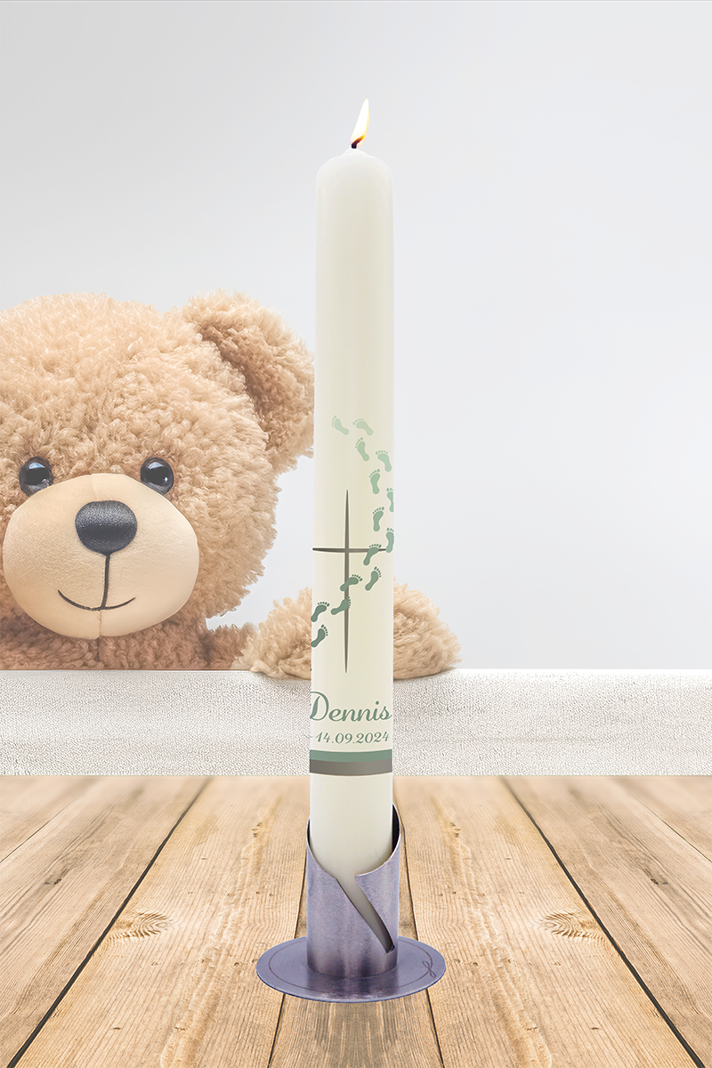 Der Weg aus Fußspuren auf dieser Kerze steht symbolisch für den Lebensweg – manchmal sanft, manchmal herausfordernd, doch stets begleitet. Das silberne Kreuz darüber ist Ausdruck von Gottes schützender Hand und Wegbegleitung. Die Taufkerze für „Dennis“ strahlt Würde, Klarheit und Vertrauen aus – und erinnert daran, dass kein Schritt allein gegangen wird.