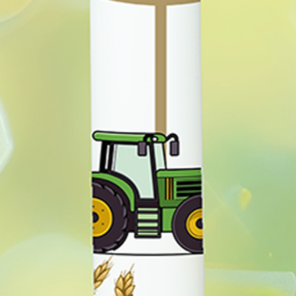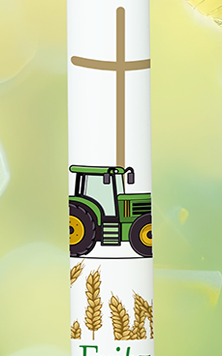 Manchmal darf Dein Licht genau so bodenständig und herzlich sein: Der grüne Trecker mit seinen gelben Reifen steht im Kornfeld vor einem schlichten Kreuz und zeigt, wie sehr Du verwurzelt bist. Dein Name und Datum machen diese Kerze zu einem besonderen Symbol für Heimat, Zusammenhalt und Gottes Segen auf allen Wegen.