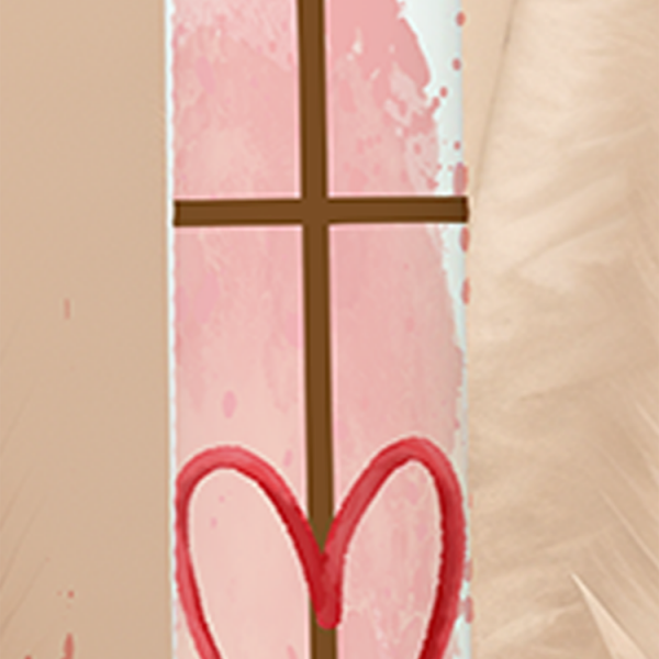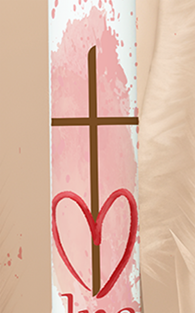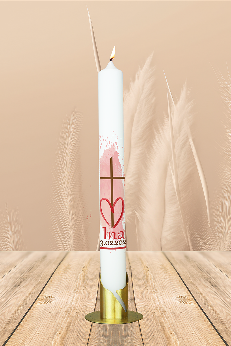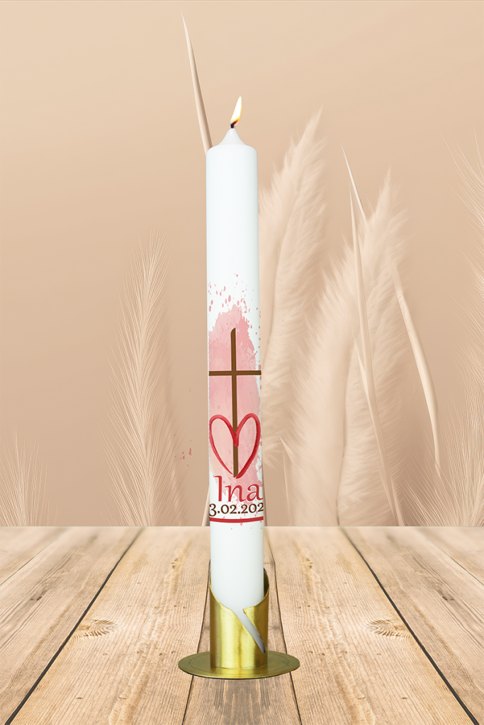 Diese Kerze vereint das Symbol der Liebe – das Herz – mit dem Kreuz als Zeichen des Glaubens. Eingebettet in einen sanften rosa Hintergrund erzählt sie von Geborgenheit, Vertrauen und Zuwendung. Der Name „Ina“ und das Datum in warmen Erdtönen machen sie zu einem besonders liebevollen Licht zur Taufe.