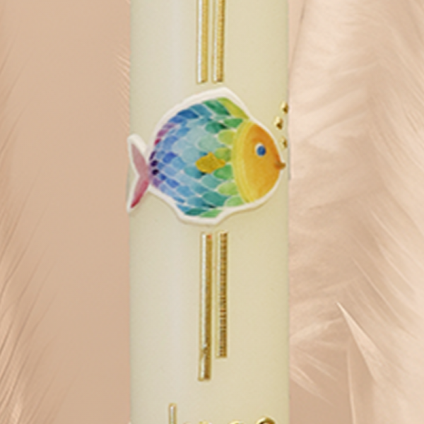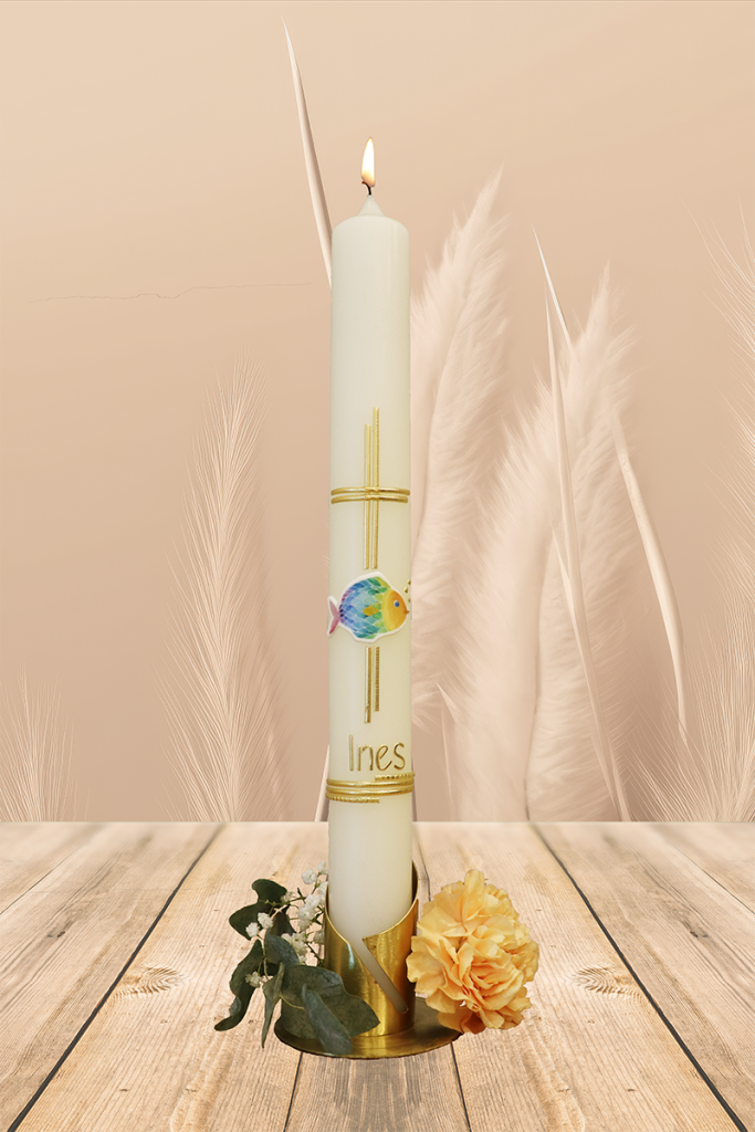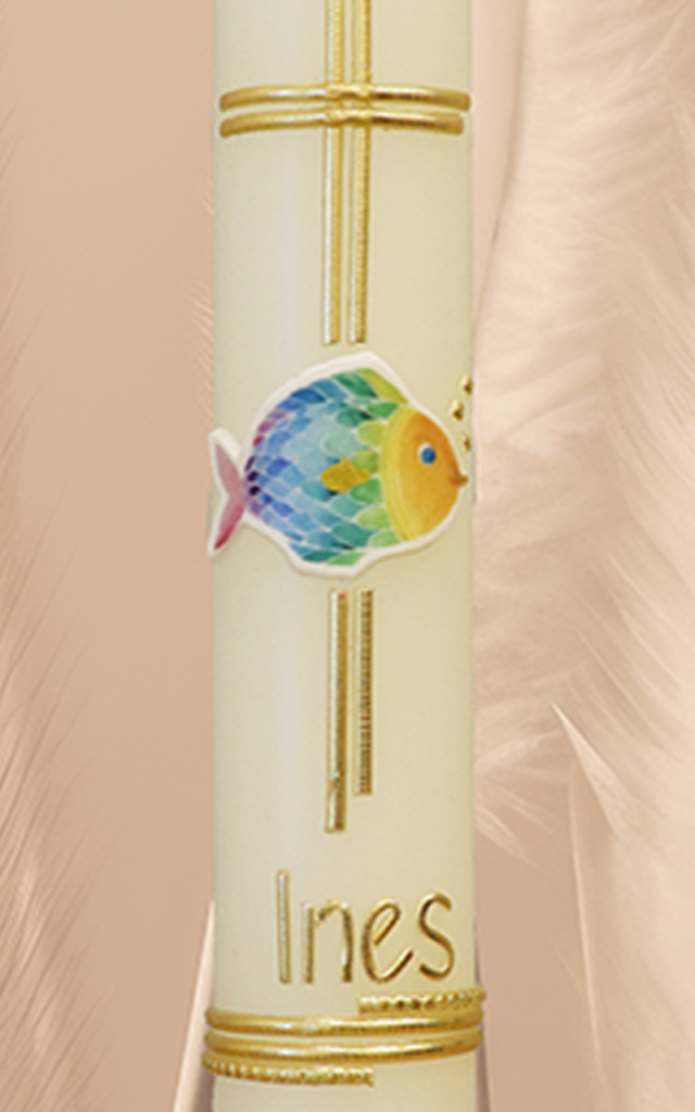 Ein Fisch, bunt wie ein Regenbogen, eingefasst in ein goldenes Kreuz, macht diese Kerze zu einem besonderen Symbol für Hoffnung, Vertrauen und Zusammenhalt. Jeder Blick erinnert daran, dass Du immer Deinen Platz hast – egal, wie groß das Wasser um Dich ist. Dein Name und Datum machen dieses handverzierte Licht zu Deinem ganz persönlichen Segenszeichen.