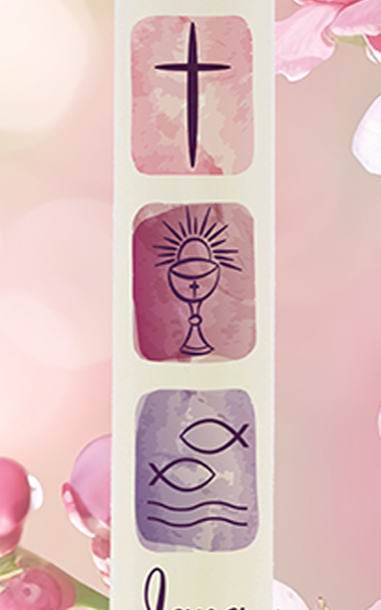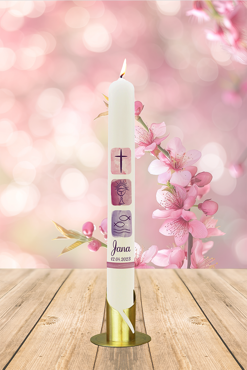 Diese moderne Kerze zeigt drei zentrale Symbole des christlichen Glaubens: das Kreuz für Gottes Nähe, den Kelch für das Sakrament und die Fische als Erkennungszeichen der frühen Christen. Mit ihrer zarten Aquarell-Optik und dem Namen „Jana“ wird sie zu einer bedeutungsvollen Taufkerze mit stilvoller Tiefe.