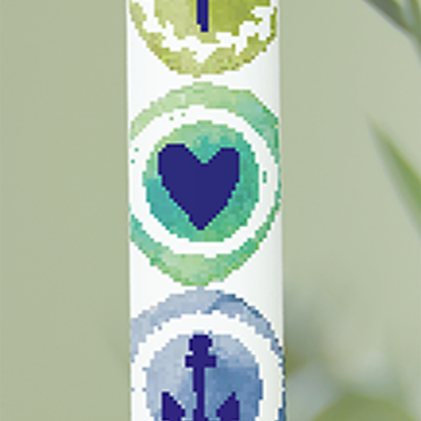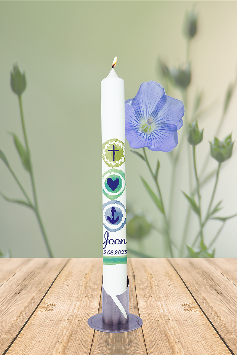 Glaube, Liebe, Hoffnung – dargestellt durch Kreuz, Herz und Anker in zarten Aquarellfarben. Diese Taufkerze bringt die drei stärksten christlichen Symbole auf moderne Weise zusammen. Mit dem Namen „Joan“ und einem personalisierbaren Datum wird sie zu einem kraftvollen Licht fürs Leben.