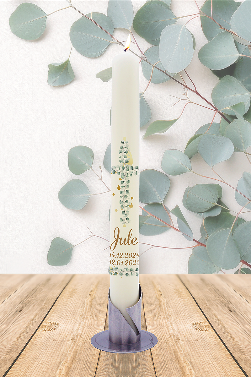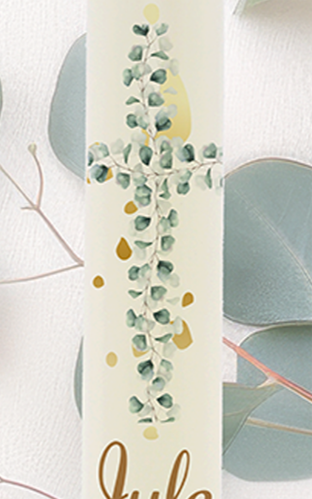 Natürliche Schönheit und schlichte Eleganz: Das Kreuz und der Rand aus Eukalyptusblättern verleihen dieser Kerze eine beruhigende, moderne Ausstrahlung. Sie symbolisiert Wachstum, Segen und Frieden. Mit Namen und zwei möglichen Daten (z.?B. Geburt & Taufe) personalisiert, wird sie zu einem ganz besonderen Erinnerungsstück.