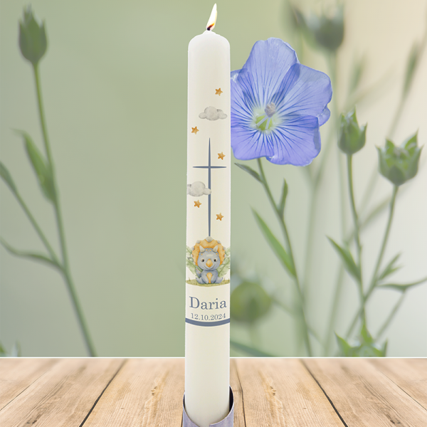 Das rosa Kreuz als zartes Zeichen des Glaubens wird hier von Schmetterlingen umspielt – Symbol für Verwandlung, Hoffnung und Leichtigkeit. Der Name „Kim“ in sonnigem Gelb macht diese Kerze zu einem lebensfrohen Licht voller Segen und Freude.