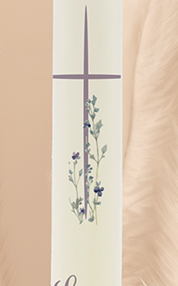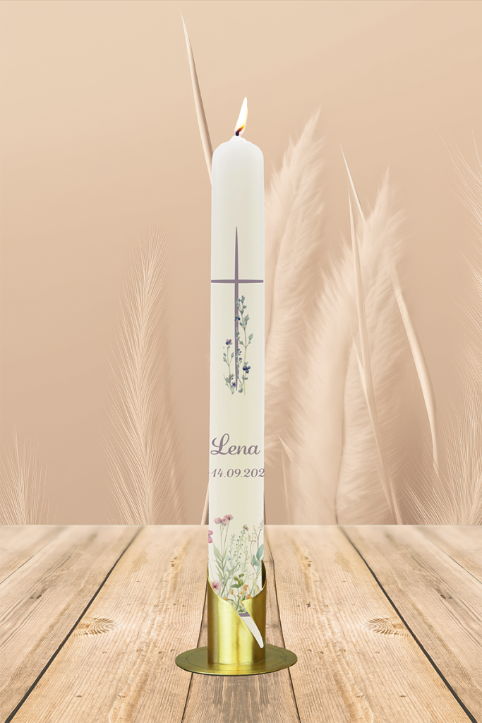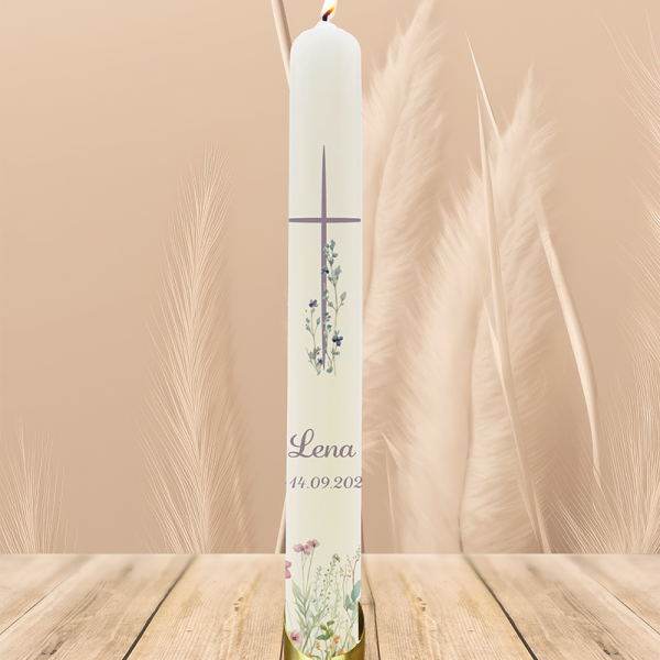 Sanft, blühend und lichtvoll: Das lilafarbene Kreuz über einer frühlingshaften Blumenwiese bringt die Botschaft vom blühenden Glauben und neuer Hoffnung. Mit dem Namen „Lena“ ( personalisierbar) und einem feinen, harmonischen Farbschema wird diese Taufkerze zu einem liebevollen Licht für einen gesegneten Neubeginn.