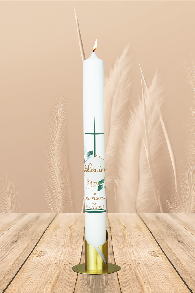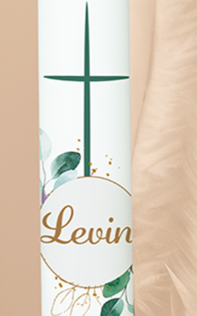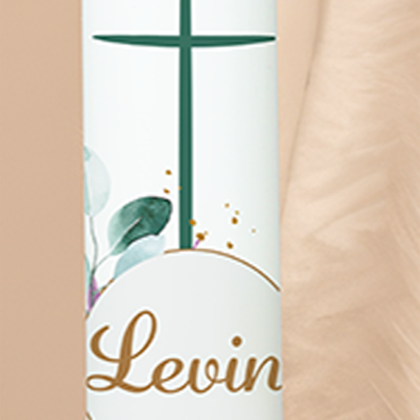 Sanft und naturverbunden zeigt sich diese Taufkerze mit einem Eukalyptuszweig vor einem grünem Kreuz – ein Zeichen für Wachstum, Stärke und Segen. Die beiden Daten (z.?B. Geburt & Taufe) machen sie zu einem persönlichen Lichtbegleiter für einen einzigartigen Lebensanfang. Der Name „Levin“ ist liebevoll eingebunden und kann individuell angepasst werden.