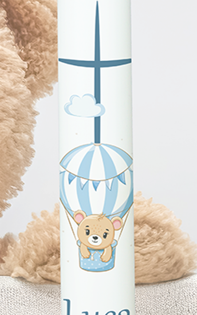 Ein blau-weißer Heißluftballon steigt sanft empor – ein starkes Sinnbild für Aufbruch, Hoffnung und göttlichen Rückenwind. Die Kerze für „Luca“ ist modern, freundlich und leicht zu personalisieren – für einen besonderen Start ins Leben.