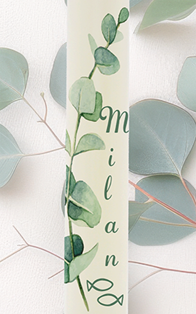 Eine filigrane Eukalyptusranke windet sich sanft über diese Kerze – sie steht für Beständigkeit, Hoffnung und natürliche Schönheit. In Kombination mit zwei wichtigen Lebensdaten und dem Namen „Milan“ entsteht eine moderne, schlichte und dennoch sehr bedeutungsvolle Taufkerze.
