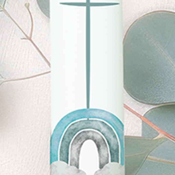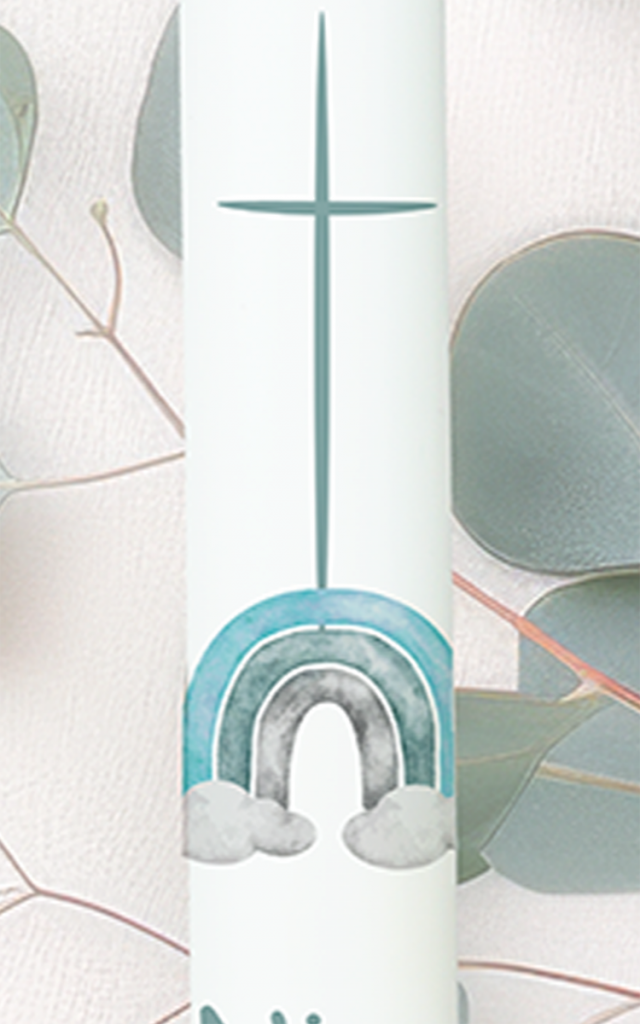 Ein farbenfroher Regenbogen überspannt ein schlichtes Kreuz – Symbol für Gottes Versprechen, neue Wege und Geborgenheit. Die Kerze für „Nico“ verbindet Fröhlichkeit mit spiritueller Tiefe. Name und Datum können selbstverständlich angepasst werden.