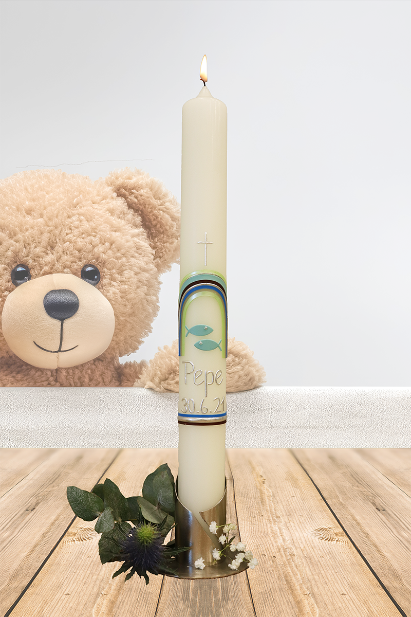 Frisch, klar und lebendig erinnert Dich dieser blaue und grüne Regenbogen daran, dass jeder Tag ein Geschenk ist. Das feine Silberkreuz und die silberne Schrift verbinden alles mit Deinem Glauben und Deinen Wünschen. Mit Deinem Namen und Datum wird aus dieser Kerze ein handveredeltes Licht, das Dich immer daran erinnert, dass Du beschützt bist – egal, wohin Dein Weg Dich führt.