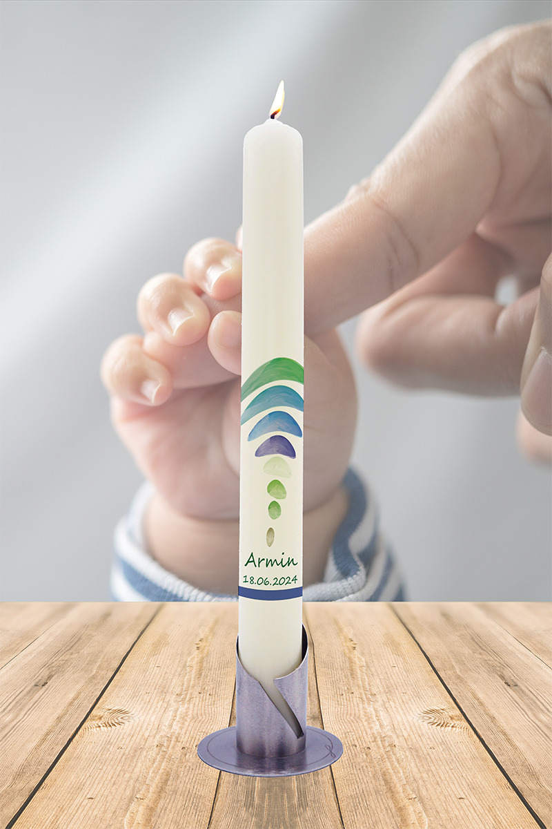 Frisch, modern und voller Hoffnung: Der blau-grüne Regenbogen steht für neue Wege, Vertrauen und Zusammenhalt. Das silberne Kreuz verbindet Deinen Glauben mit allem, was Dich trägt. Mit Deinem Namen und Datum wird diese Kerze zu Deinem ganz eigenen Licht, das sagt: Du darfst wachsen, träumen und glauben.