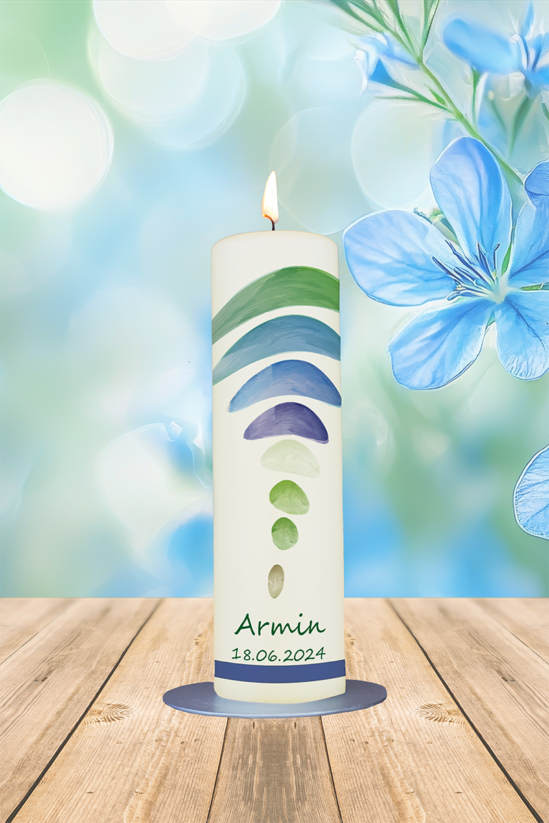 Frisch und hoffnungsvoll erzählt dieser moderne Regenbogen in Blau und Grün davon, dass nach jedem Regen wieder Licht kommt. Das feine silberne Kreuz verbindet all Deine Wünsche mit Segen und Vertrauen. Mit Deinem Namen und Datum wird diese Kerze zu Deinem ganz eigenen Lichtmoment, der Dich daran erinnert, dass Du getragen bist – egal, wohin Dein Weg Dich führt.