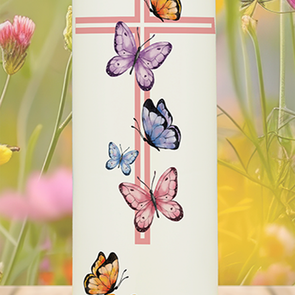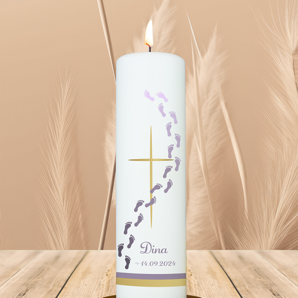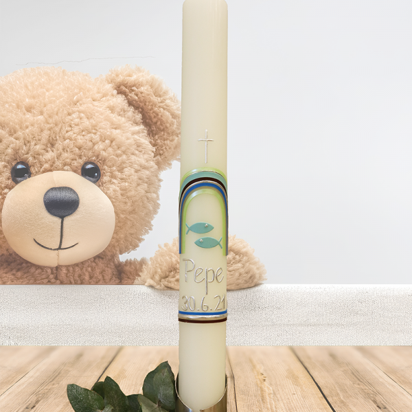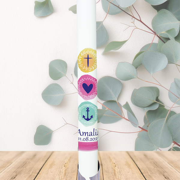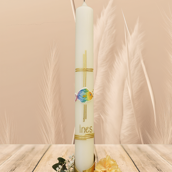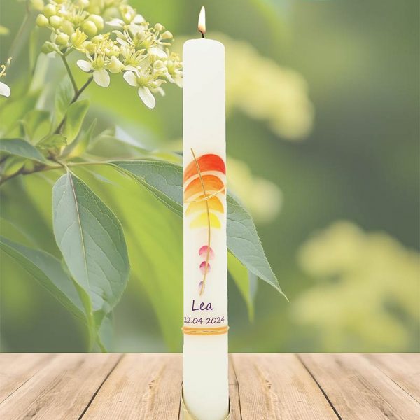 Dieser Regenbogen in warmen Gelb- und Orangetönen bringt Sonne ins Herz. Das silberne, leicht gebogene Kreuz verbindet diesen Lichtmoment mit allem, was Dich stärkt. Dein Name und Datum machen aus dieser Kerze ein strahlendes Symbol dafür, dass Du mit Deinem Glauben immer Deinen ganz eigenen Weg gehen darfst – bunt, lebendig und voller Wärme.