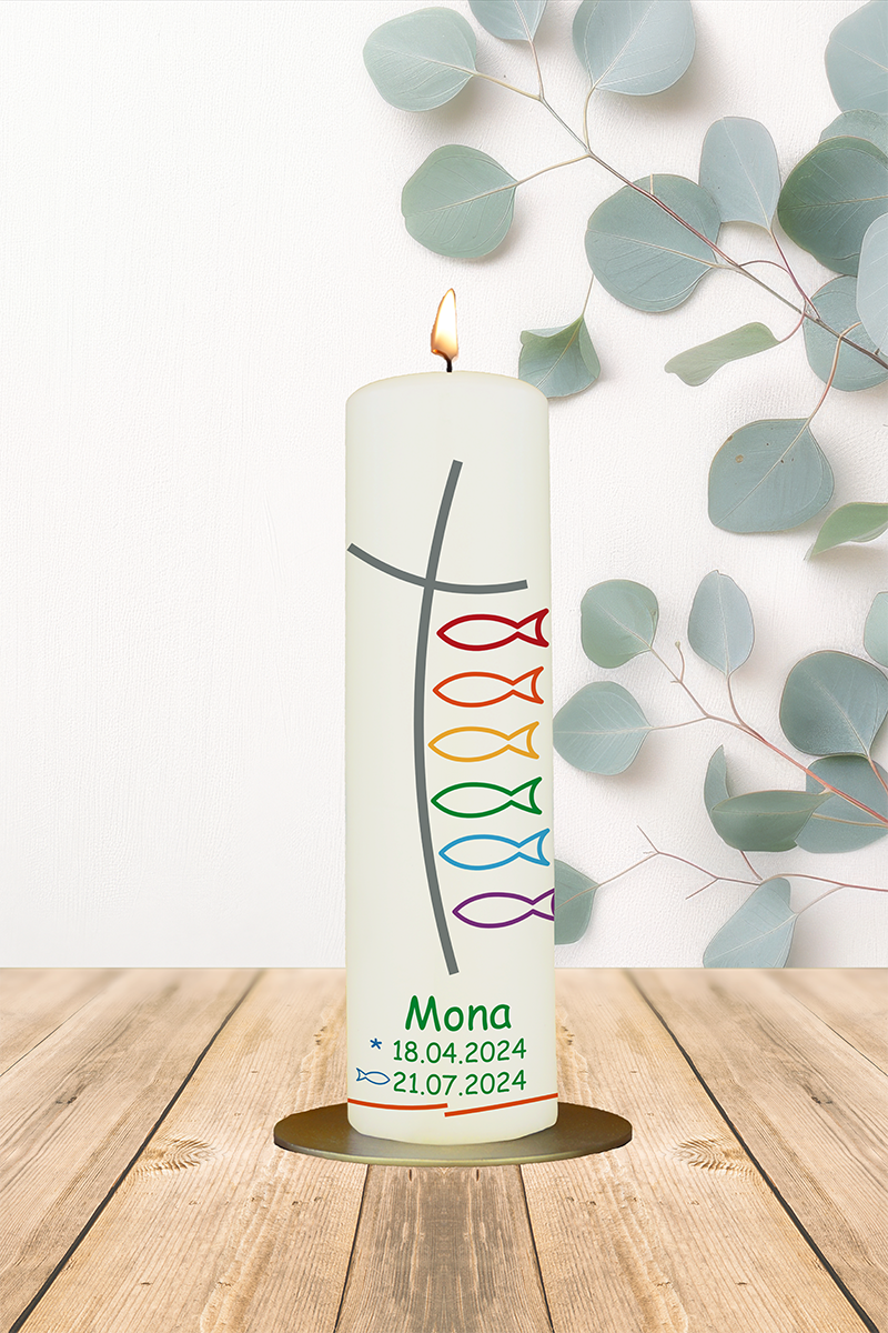 Jeder Fisch in einer anderen Regenbogenfarbe erzählt von Gemeinschaft, Vielfalt und Zusammenhalt. Das feine silberne Kreuz verbindet alles, was Dir Halt gibt. Dein Name und Datum machen diese Kerze zu Deinem persönlichen Lichtmoment, der Dich daran erinnert, dass Du immer Teil von etwas Größerem bist – geborgen, geliebt und begleitet.