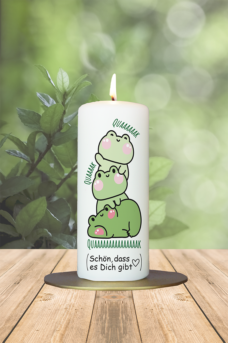 Drei fröhliche Frösche quaken sich übereinander und sagen laut und deutlich, was zählt: „Schön, dass es Dich gibt!“ Diese Kerze ist ein herzlicher Lichtgruß mit Humor – perfekt für Freund:innen, Familie oder Menschen, die einfach ein bisschen grün-verliebte Frösche und ganz viel Wertschätzung verdient haben.