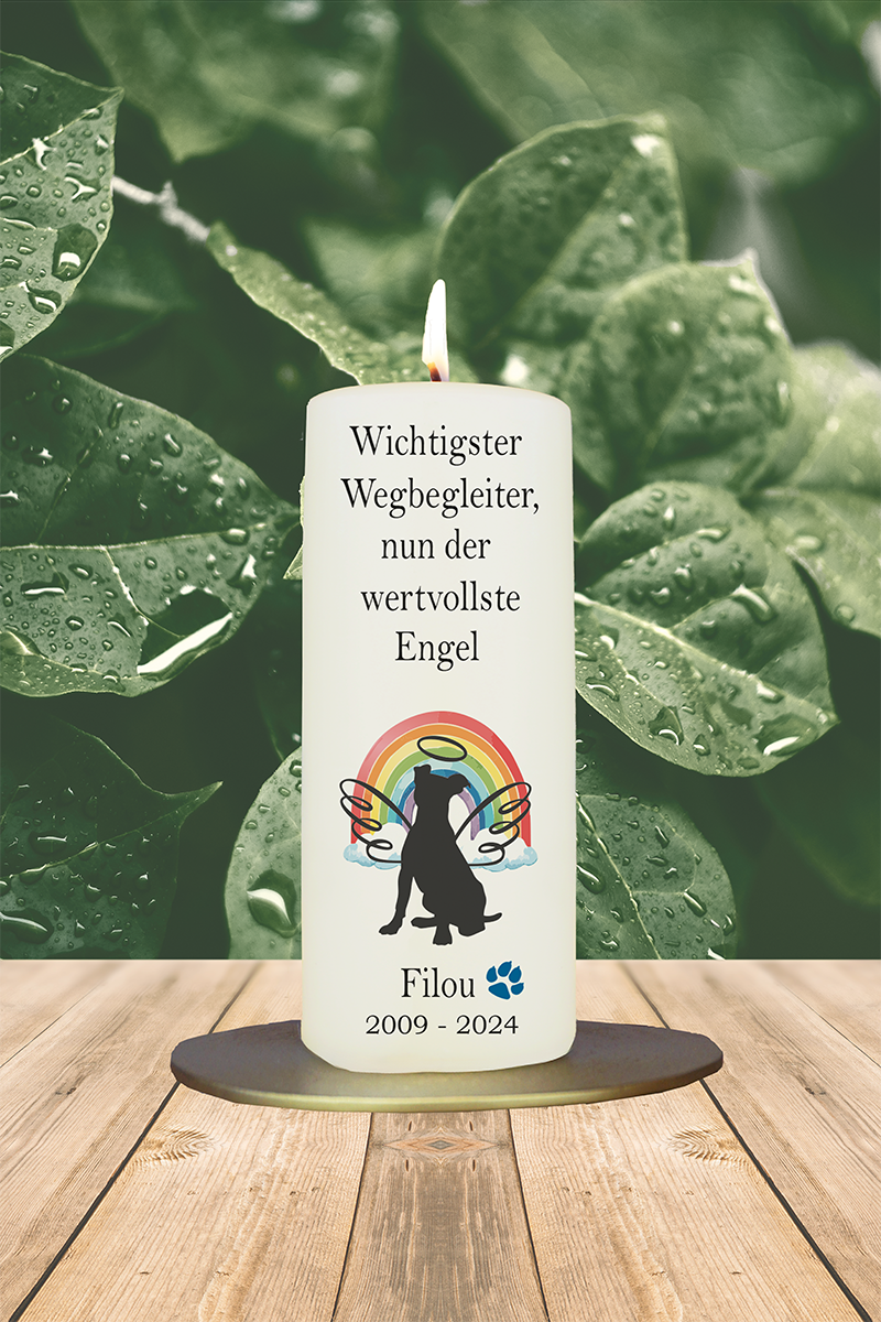 Diese Kerze ist eine Hommage an einen Hund, der nicht nur Haustier war, sondern fester Teil des Herzens. Der Regenbogen als Zeichen des Übergangs, die Engelsflügel als Symbol für das Weiterleben der Seele – all das vereint diese Kerze mit dem bewegenden Text. Mit Name und Lebensjahren personalisierbar, ist sie ein stilles Erinnerungslicht für treue Freundschaft ohne Worte.