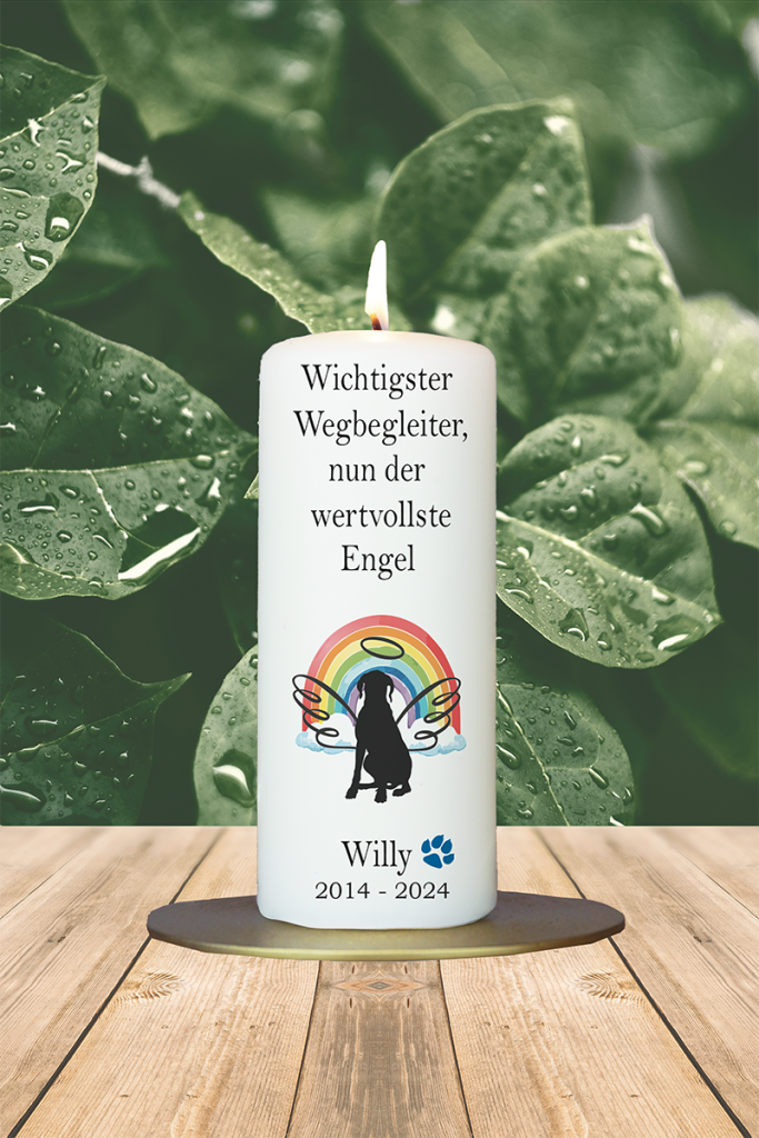 Diese Kerze ist eine Hommage an einen Hund, der nicht nur Haustier war, sondern fester Teil des Herzens. Der Regenbogen als Zeichen des Übergangs, die Engelsflügel als Symbol für das Weiterleben der Seele – all das vereint diese Kerze mit dem bewegenden Text. Mit Name und Lebensjahren personalisierbar, ist sie ein stilles Erinnerungslicht für treue Freundschaft ohne Worte.