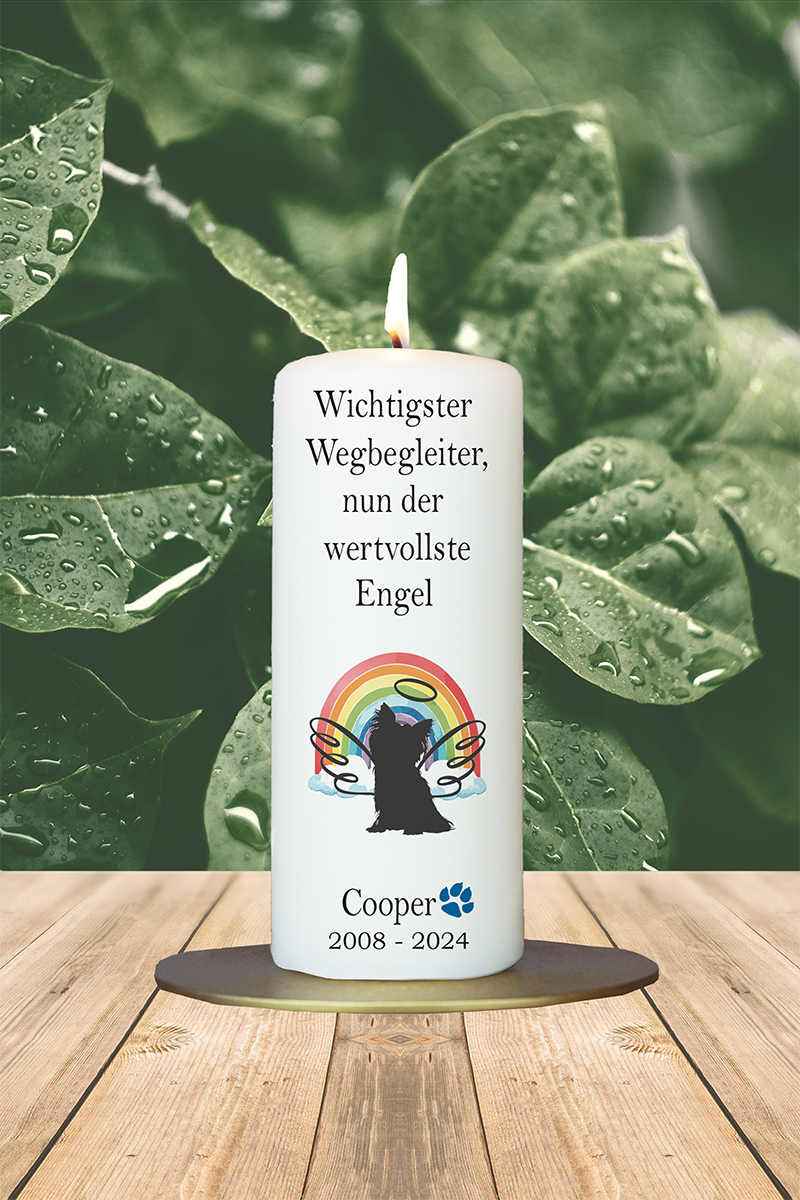 Diese Kerze ist eine Hommage an einen Hund, der nicht nur Haustier war, sondern fester Teil des Herzens. Der Regenbogen als Zeichen des Übergangs, die Engelsflügel als Symbol für das Weiterleben der Seele – all das vereint diese Kerze mit dem bewegenden Text. Mit Name und Lebensjahren personalisierbar, ist sie ein stilles Erinnerungslicht für treue Freundschaft ohne Worte.