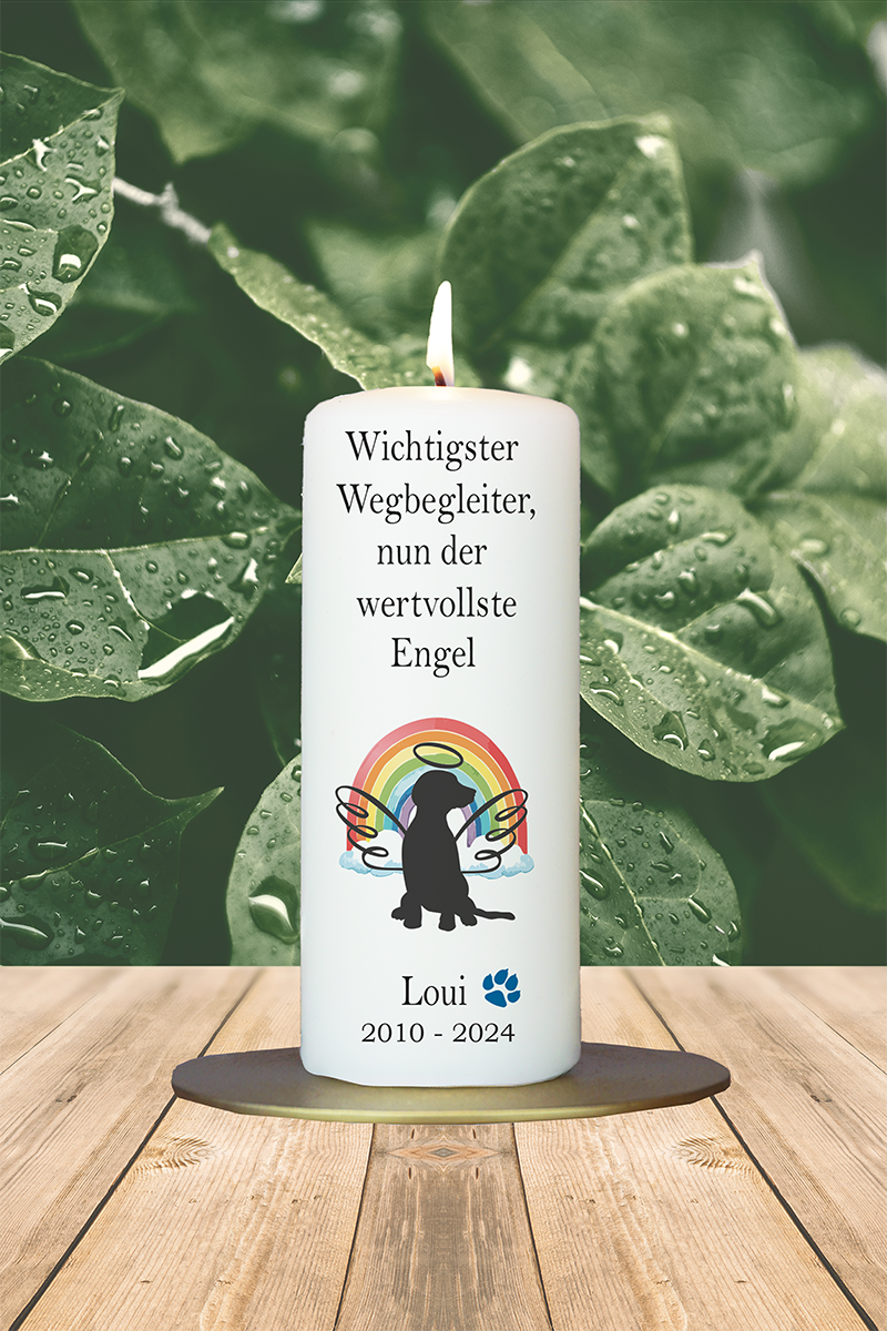 Diese Kerze ist eine Hommage an einen Hund, der nicht nur Haustier war, sondern fester Teil des Herzens. Der Regenbogen als Zeichen des Übergangs, die Engelsflügel als Symbol für das Weiterleben der Seele – all das vereint diese Kerze mit dem bewegenden Text. Mit Name und Lebensjahren personalisierbar, ist sie ein stilles Erinnerungslicht für treue Freundschaft ohne Worte.