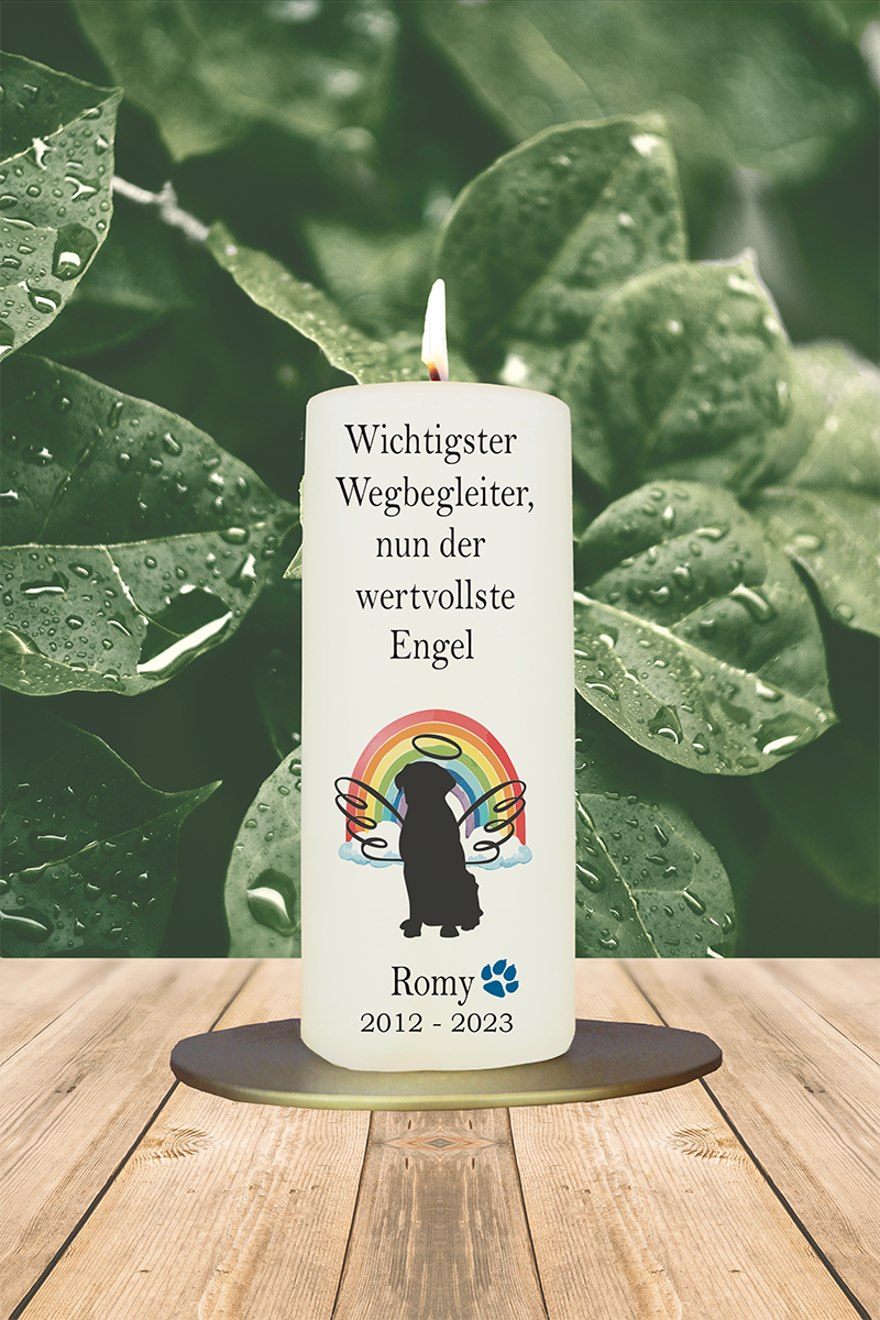 Diese Kerze ist eine Hommage an einen Hund, der nicht nur Haustier war, sondern fester Teil des Herzens. Der Regenbogen als Zeichen des Übergangs, die Engelsflügel als Symbol für das Weiterleben der Seele – all das vereint diese Kerze mit dem bewegenden Text. Mit Name und Lebensjahren personalisierbar, ist sie ein stilles Erinnerungslicht für treue Freundschaft ohne Worte.